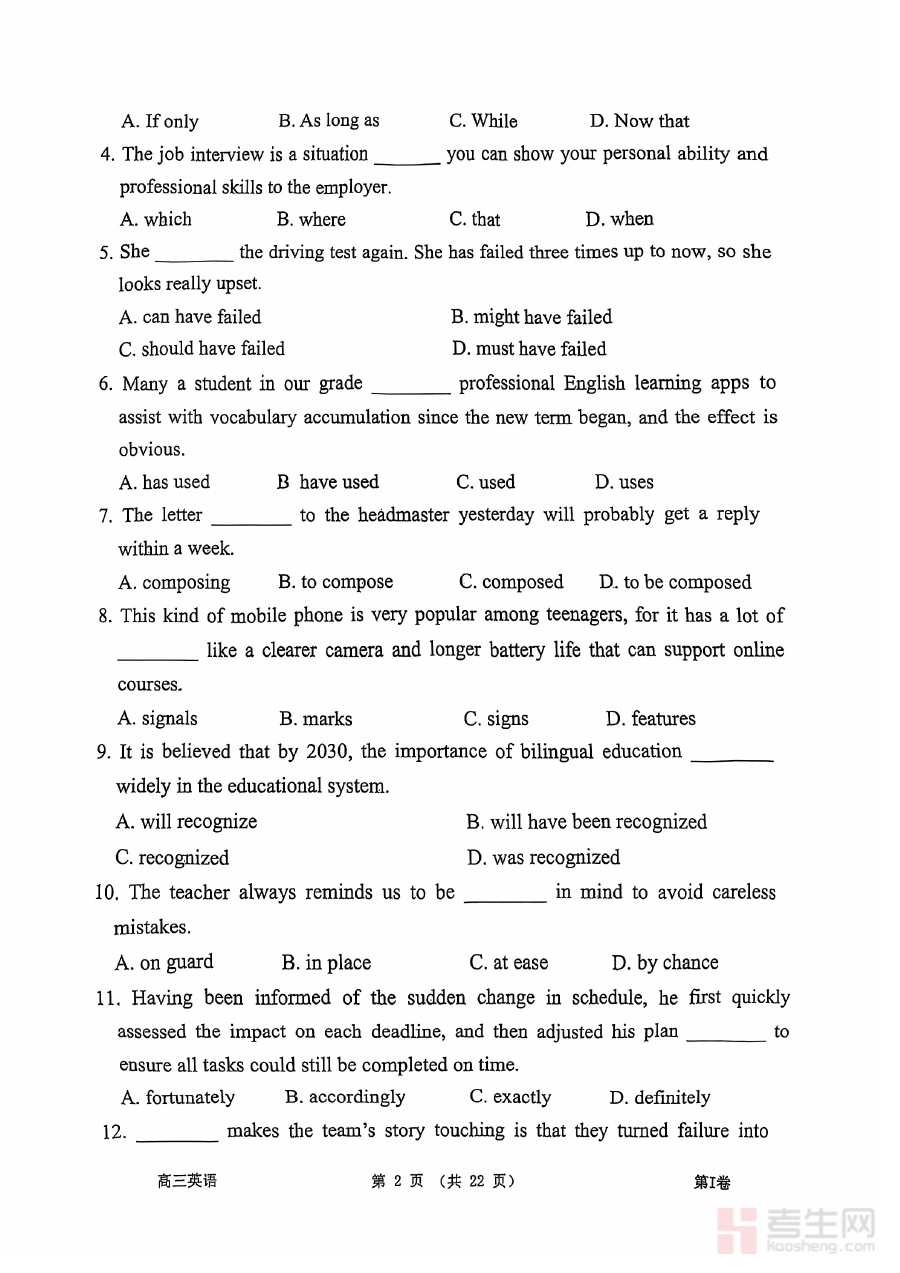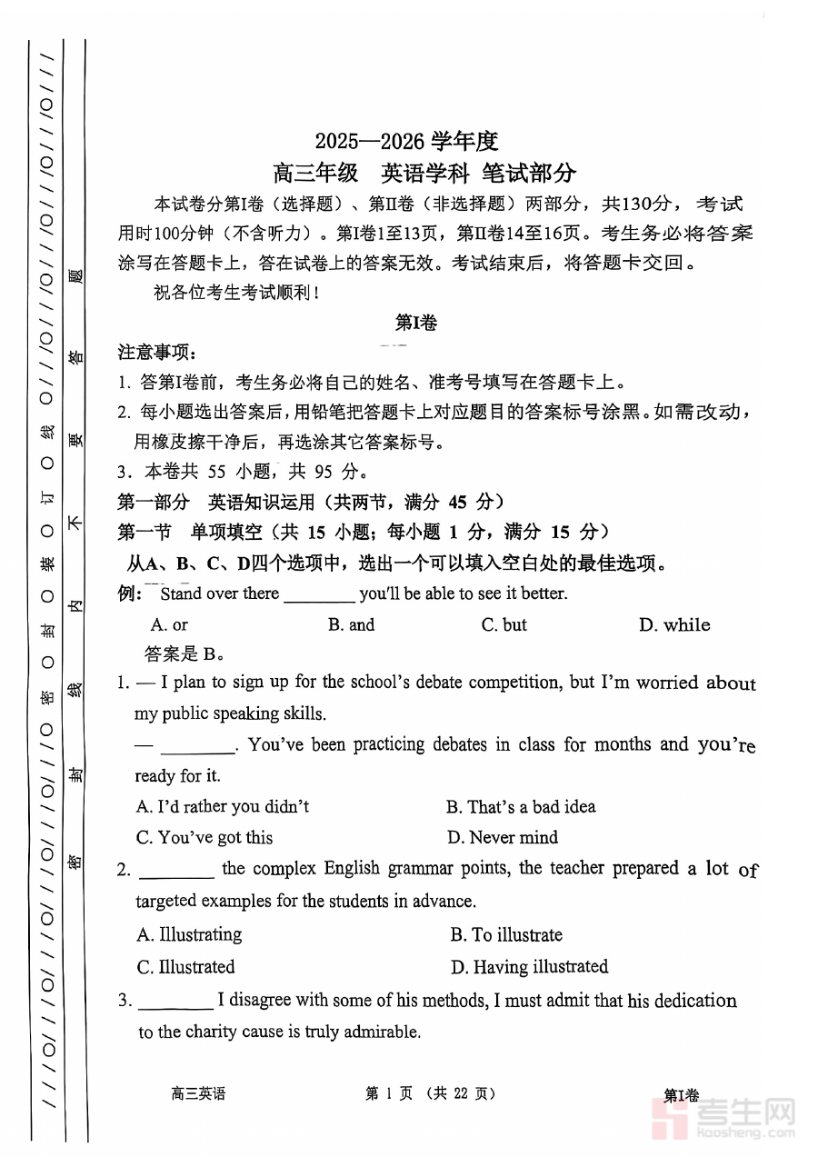 《南开区25-26高三一模【英语试题】》是25-26学年天津市南开区针对高三年级学生组织的第一次模拟考试的英语学科正式试题资料,属于高三阶段关键的阶段性备考资源。它严格遵循该学年南开区高三英语教学大纲与区域考试命题导向,能够帮助使用者提前熟悉一模考试的整体结构、考查范围与命题风格,为后续的系统复习与备考安排提供可靠的参考依据,助力使用者快速适应区域考试的特点与要求。