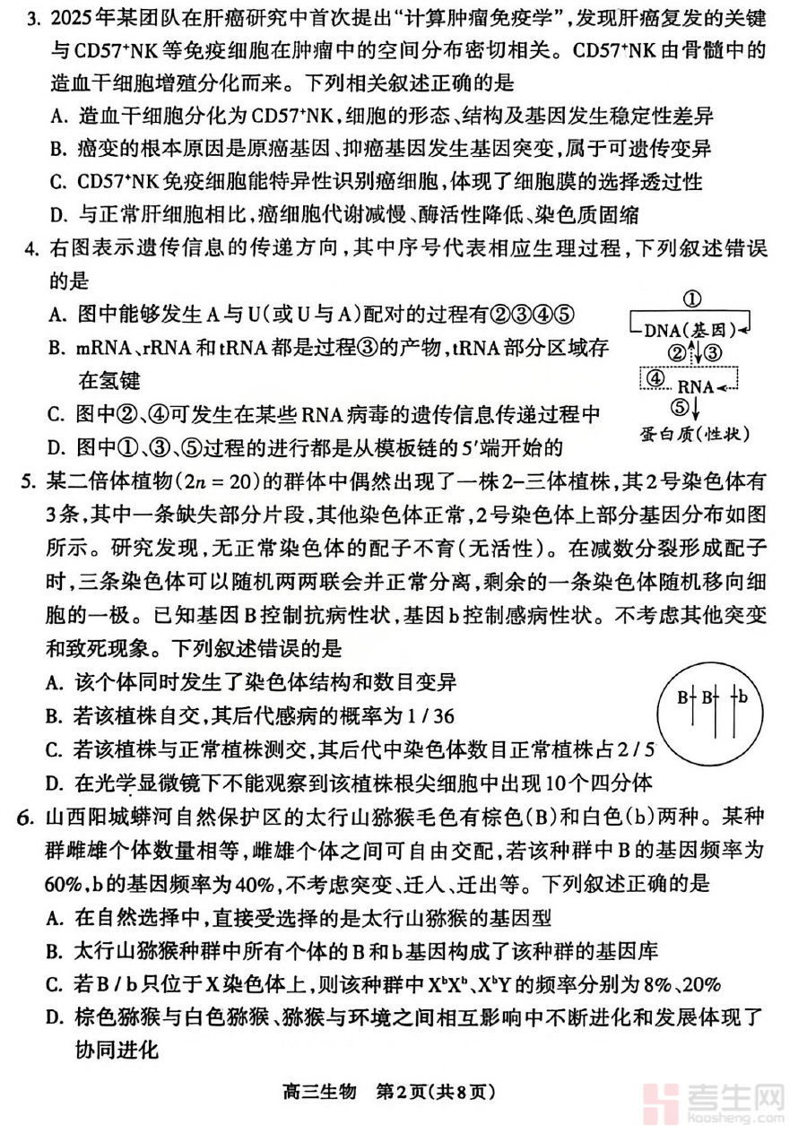 该资料主要适用于吕梁市2025-2026学年的高三学生群体,助力其熟悉模拟调研测试的形式与要求,增强应试适应性;对于生物学科教师而言,可借助该资料开展教学效果评估与反馈,优化教学策略;此外教育管理部门也可将其作为区域学业质量分析的参考素材,推动整体备考工作科学有序推进。