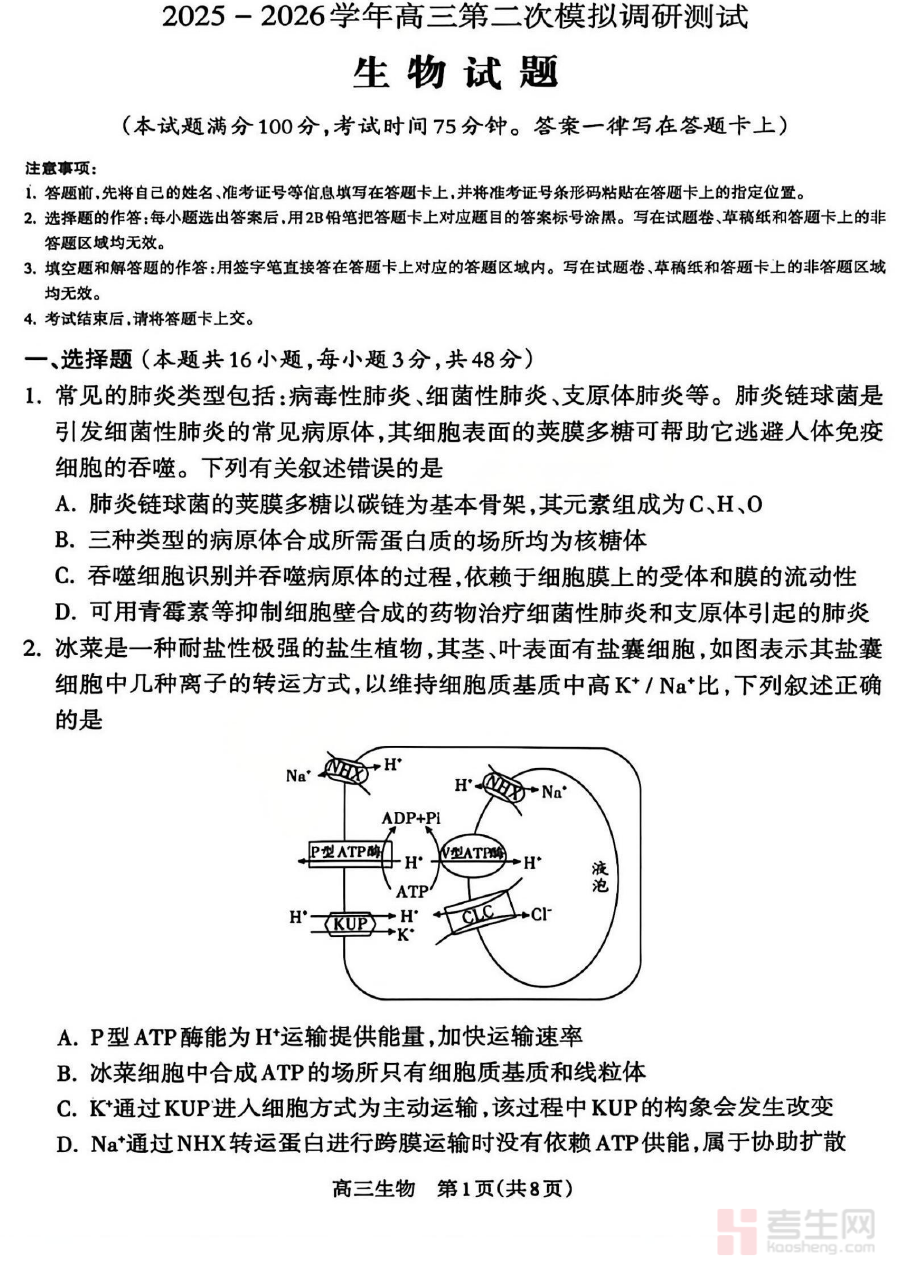 《吕梁市2025-2026学年高三第二次模拟调研测试 生物》是吕梁市在2025至2026学年面向高三学生开展的第二次模拟调研性质的生物学科测试相关备考资料,该考试属于区域内标准化阶段性学业质量检测范畴,旨在通过规范的测试流程与内容设置,客观反映高三学生生物学科的阶段性学习成效与知识掌握状况。