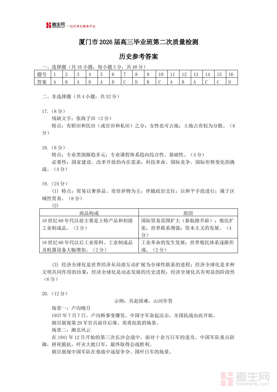 《厦门市2026届高中毕业班模拟测试 历史答案》是厦门市针对2026届高中毕业班学生组织的历史学科模拟测试的配套答案资料,聚焦该地区特定届次高中毕业生的历史学科阶段性检测需求,作为模拟测试体系的重要组成部分,为考生及教学工作者提供与测试内容对应的标准化参考依据,支撑相关主体对测试结果进行科学解读与深度分析。