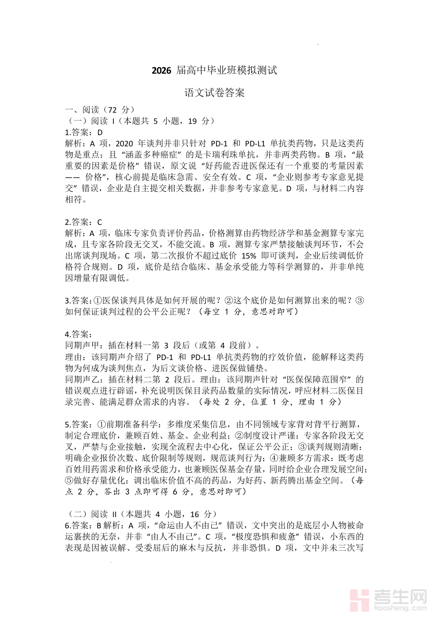 《厦门市2026届高中毕业班模拟测试 语文答案》是厦门市针对2026届高中毕业班组织的模拟测试对应的语文科目答案资料,属于高中阶段重要的阶段性备考辅助资源。该资料与本地高中毕业班模拟测试体系高度适配,为相关教学与备考活动提供标准化的答案参考依据。