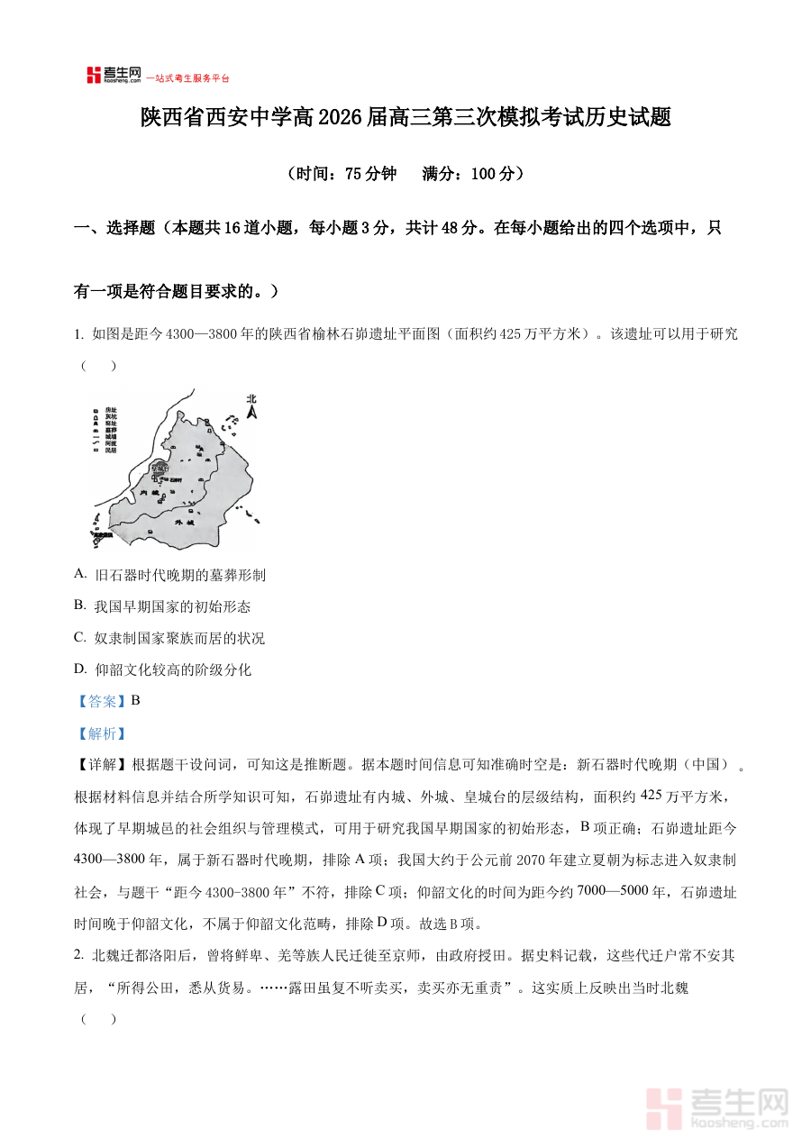 《2026届陕西省西安中学高三下学期第三次模拟考试历史试卷 Word版含解析》是面向2026届陕西省西安中学高三学生推出的阶段性历史学科模拟考试资料,紧密衔接高三下学期的复习进度,契合该校教学计划与学生备考需求,为学生搭建了贴近校内考试情境的实战练习平台,帮助学生提前适应考试节奏与题型特点。