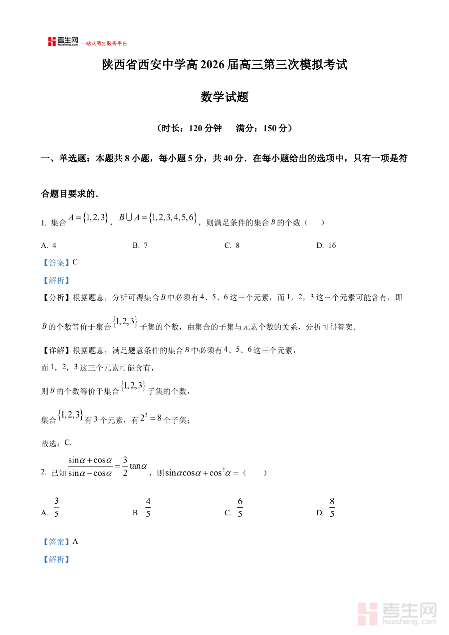 《陕西省西安中学2026届高三下学期第三次模拟考试数学试题 Word版含解析》是面向陕西省西安中学2026届高三学生的阶段性模拟考试资料,属于高三下学期关键复习阶段的重要检测工具。该资料以Word格式呈现并附带详细解析,能够为学生提供贴近本校教学进度与考试要求的练习内容,帮助学生熟悉模拟考试的形式与节奏,为后续的高考备考奠定基础。