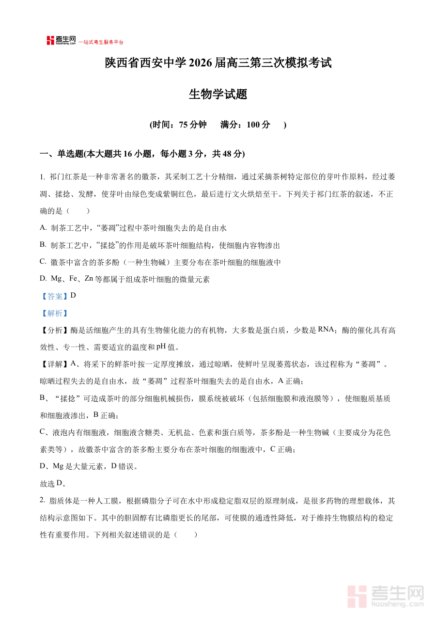 《2026届陕西省西安中学高三第三次模拟考试生物试卷 Word版含解析》是面向2026届陕西省西安中学高三学生的生物学科阶段性模拟考试资料,属于该校高三备考体系中的重要组成部分。该试卷贴合学校高三生物教学进度与考试标准,为学生提供了与校内实际考试场景高度契合的练习机会,是辅助学生进行生物学科阶段性复习的有效载体。
