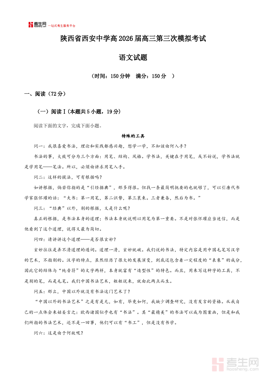 此资料主要适用于2026届西安中学高三语文教师及学生群体,同时也可为陕西省内其他同阶段高中的高三语文备考提供参考借鉴;通过参与此次模拟考试,学生能够熟悉高三后期模拟测试的流程与要求,检验阶段性复习成果并及时调整备考策略;教师可借助该试卷开展规范化检测活动,优化教学方案与复习规划,助力学生在高考前的关键冲刺阶段实现语文综合能力的稳步提升。