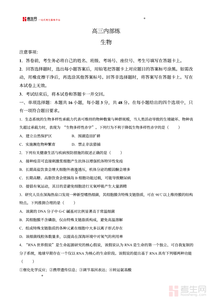 该试卷适用于2026届河南省高三学生及从事高三生物教学工作的教师群体。对于学生而言,完成这份内部练习可实现对自身阶段复习效果的全面检测,及时发现并弥补知识漏洞;对于教师而言,这份试卷能辅助优化教学计划,开展更具针对性的专题强化训练。在高三下学期4月这一关键复习节点,该试卷能有效助力师生提升生物学科备考效率,为后续的高考冲刺奠定坚实基础。