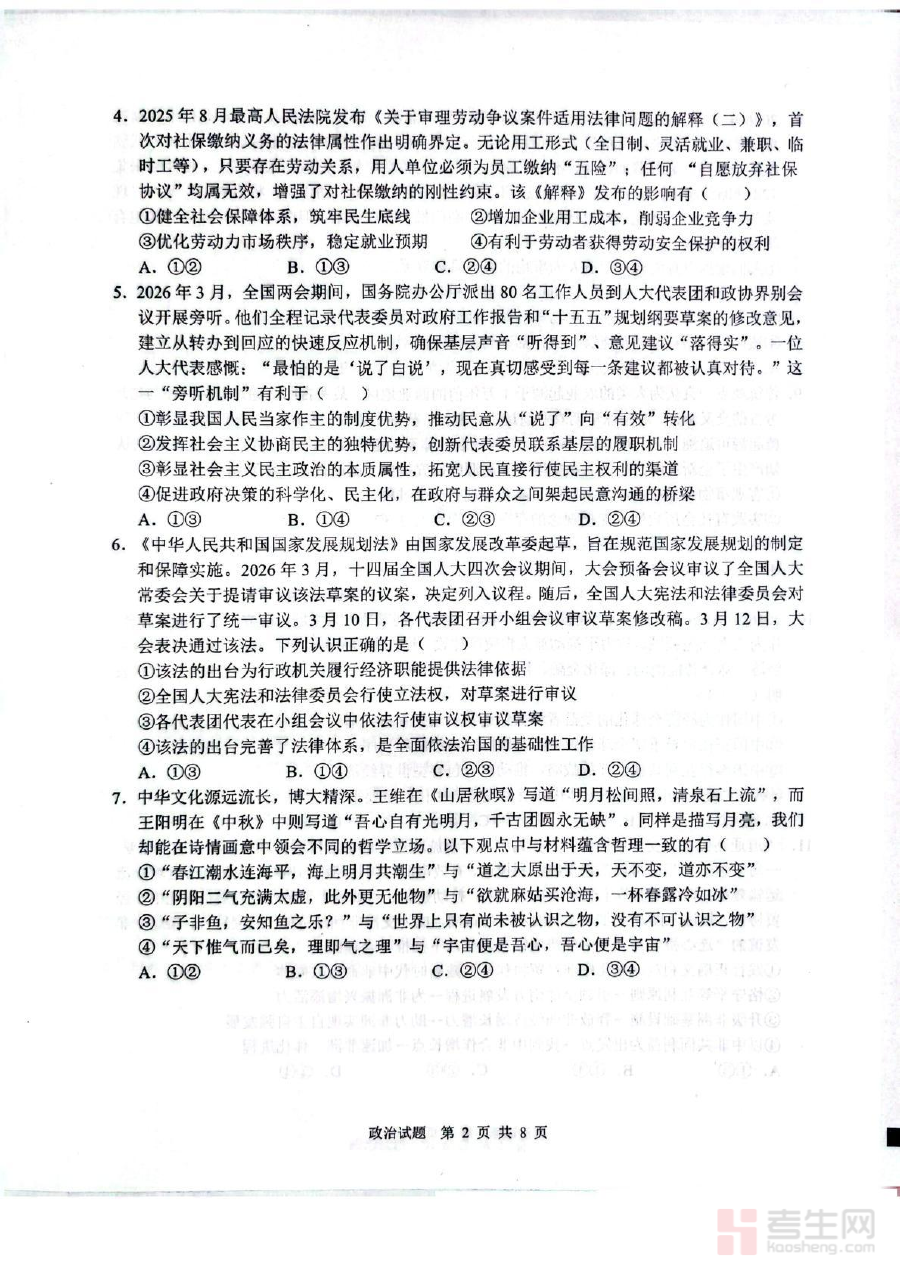 本资料适用于山东省2026届普通高中的政治学科教师及学生群体。对学生而言,它是阶段性评估学习效果、查漏补缺的重要工具,有助于明确学业水平考试前的复习方向;对教师而言,它为教学反馈提供了数据依据,可辅助优化教学方案与备考安排,最终助力学生在学业水平考试中达成预期目标,夯实政治学科基础能力。