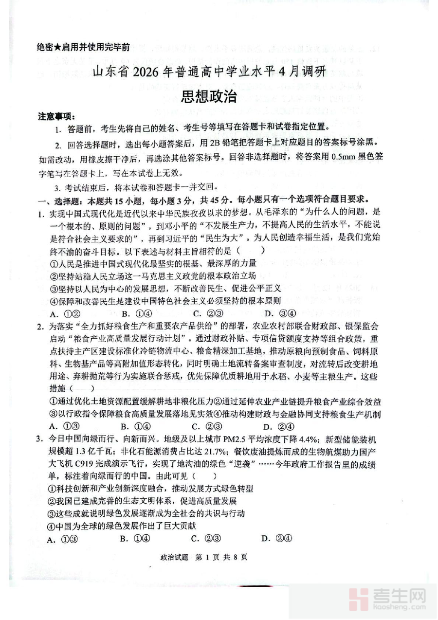 《山东省2026届普通高中学业水平4月调研政治试卷(含答案)》是针对山东省2026届普通高中学生打造的学业水平阶段性调研资料,涵盖政治学科试卷及配套参考答案两部分内容。作为贴合当地学业水平考试要求的备考资源,它聚焦该阶段学生政治学科的学习成果评估,为相关教学与备考活动提供基础支持,帮助师生把握学业水平考试的核心方向与阶段要求。