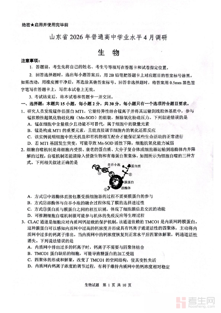 《山东省2026届普通高中学业水平4月调研生物试卷(含答案)》是面向山东省2026届普通高中学生推出的生物学科阶段性调研资料,紧密围绕该届学生的学业水平发展阶段与学业水平考试核心要求设计。作为专门的调研类试卷资料,它旨在反映学生当前生物学科学习状况,为师生提供直观学业水平参考数据,是适配该届学生学业进度的重要备考支持材料,能有效衔接日常学习与学业水平考试备考需求。