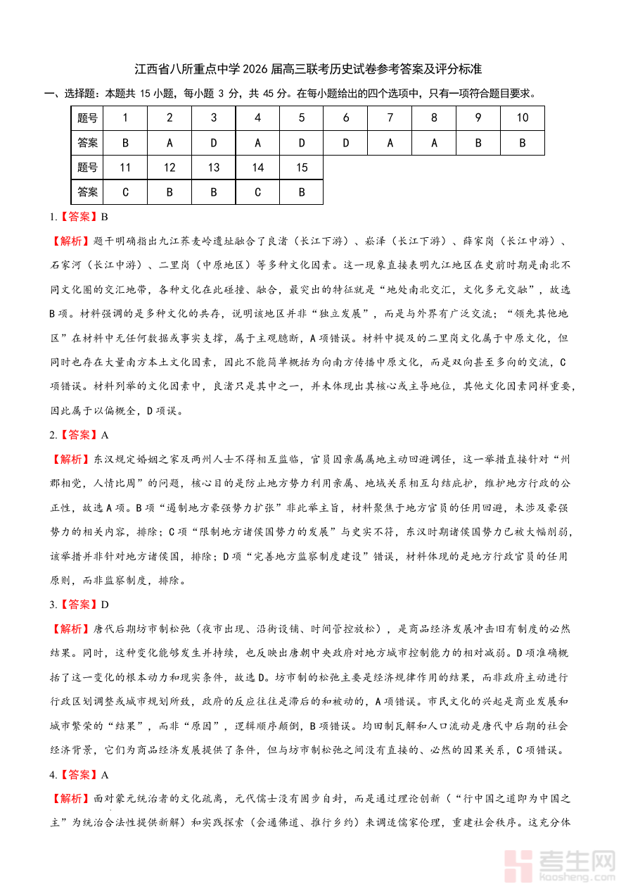 《江西省八所重点中学2026届高三联考 历史答案》是针对江西省内八所重点中学2026届高三学生联合考试的历史学科配套答案资料。该联考作为区域内重点中学协同开展的高三阶段性测试活动,旨在通过统一命题与测评,为高三历史学科的学习与备考提供标准化的参照依据,帮助相关学校和学生把握历史学科的阶段性考查方向与核心要求。