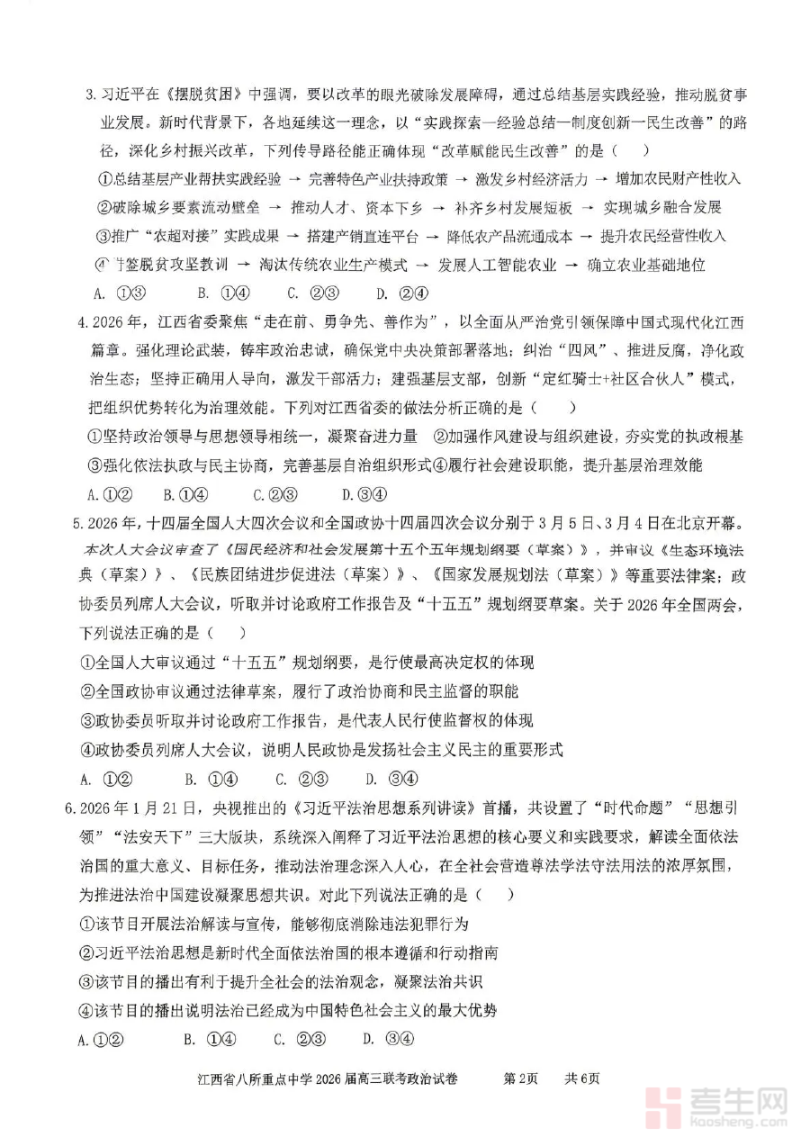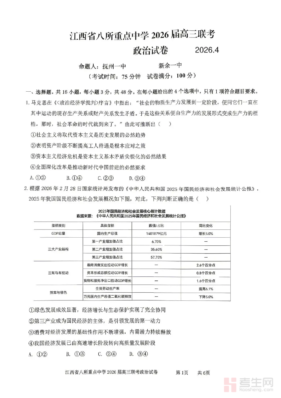 此资料适用于江西省2026届高三年级学生,尤其是参与本次联考的八所重点中学学生,通过使用该资料可有效检验阶段性学习效果,明确后续政治学科备考的重点方向;对于省内其他高三学生而言,该资料也可作为了解区域备考趋势的参考,助力提升备考针对性与效率。