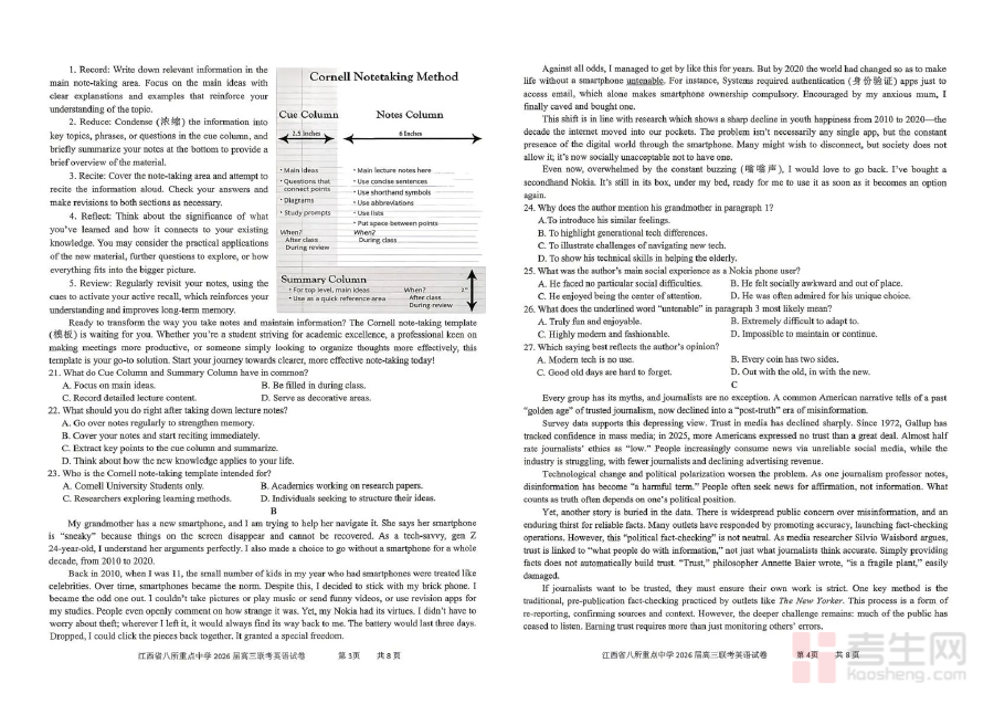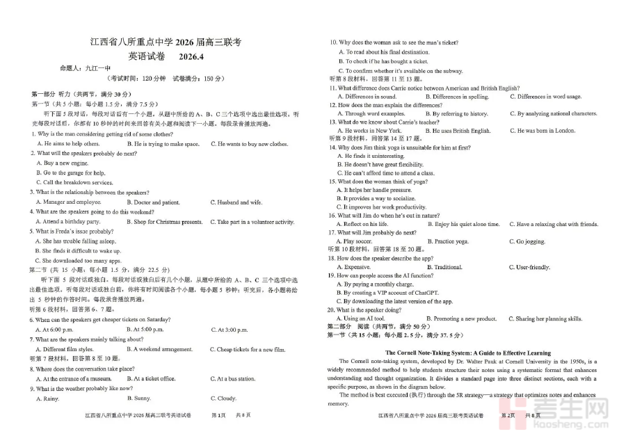 此资料适用于江西省八所重点中学2026届高三学生及具有同类学习水平的高三英语学习者。作为重点中学联合组织的考试资料,其内容与考察标准具有较强的权威性和参考价值,能够帮助学生明确自身在区域内的学习定位,针对性强化薄弱环节,提升英语学科综合能力,为高考前的系统复习和应试准备提供有力支持。