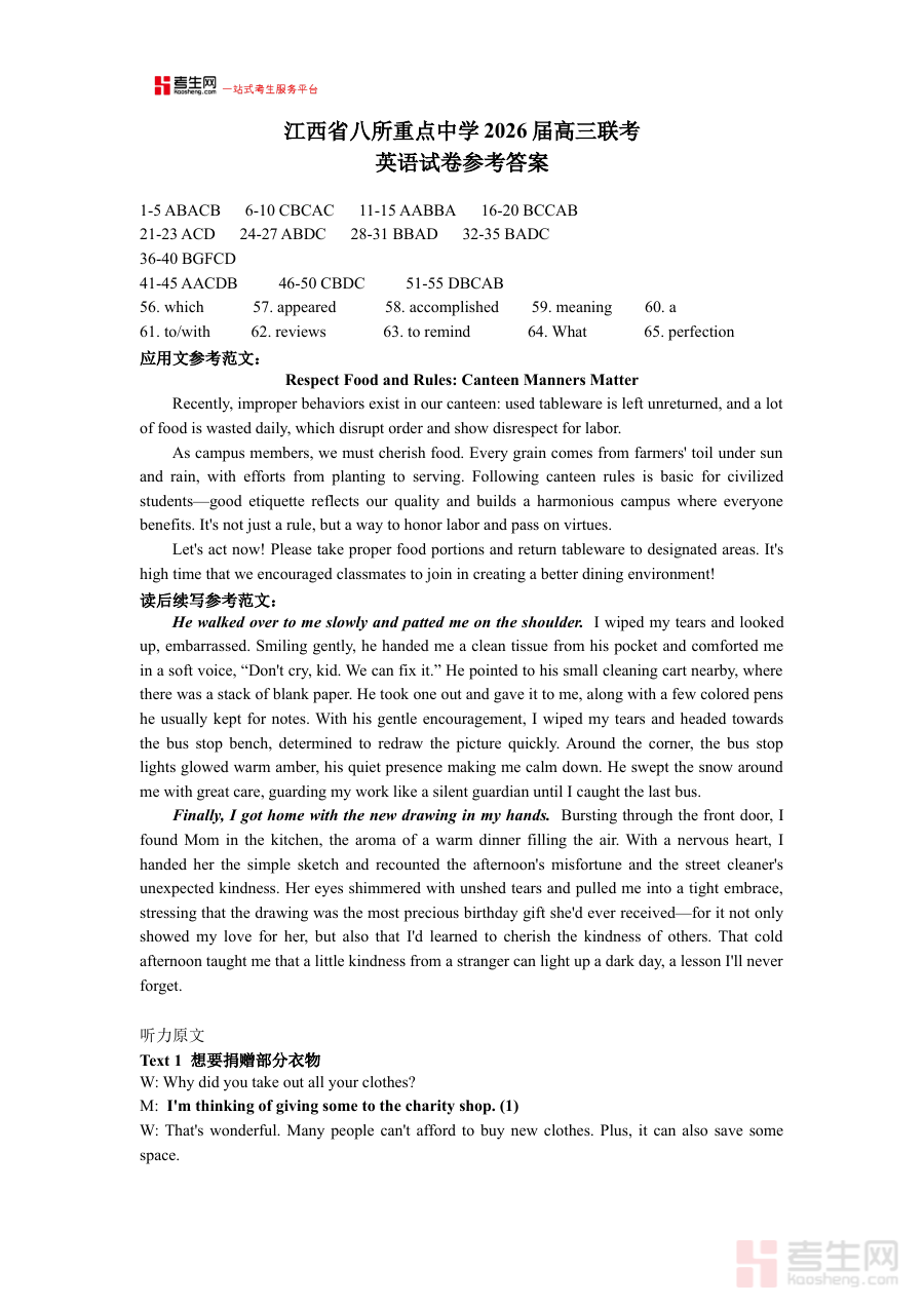 《江西省八所重点中学2026届高三联考 英语答案》是针对江西省八所重点中学联合组织的2026届高三学生英语联考的配套答案资料。该考试属于区域性重点中学协作开展的阶段性检测,覆盖江西省内具有代表性的优质高中,旨在通过统一命题和测评,为高三学生提供阶段性学习成果的参照标准。作为联考的重要组成部分,答案资料与考试内容紧密对应,能够帮助使用者快速核对答题情况,明确考试中的知识点掌握程度与答题规范差异。