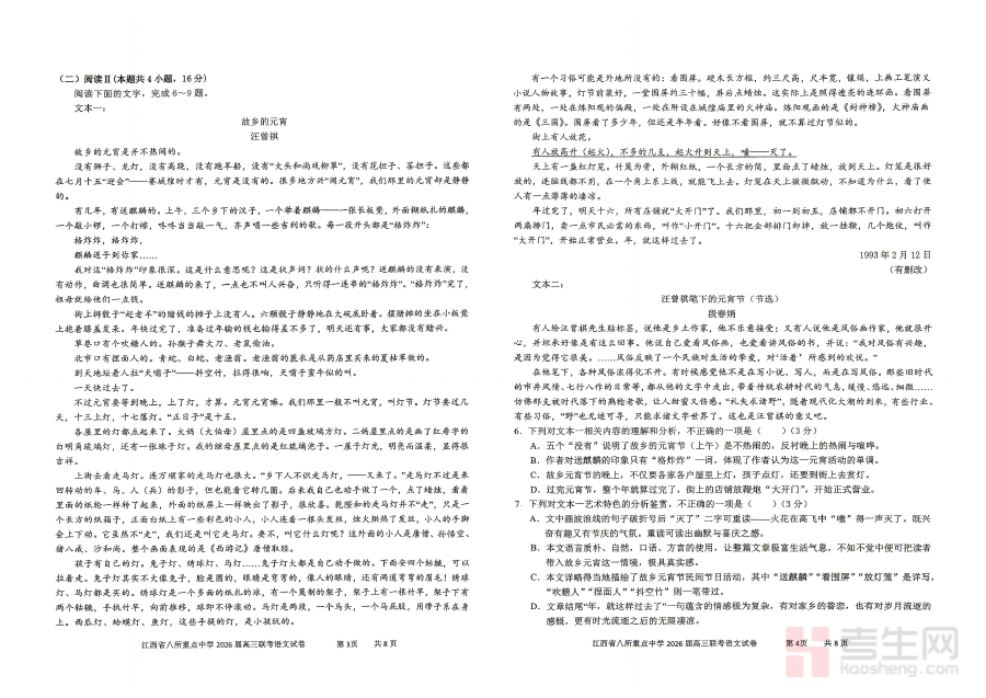 《江西省八所重点中学2026届高三联考 语文》是2026届江西省高三阶段的区域性联考语文科目备考资料,由省内八所重点中学联合推出。作为高三关键阶段的重要检测资料,它紧密衔接高三语文复习进度,为学生提供与省级重点中学同层级的考试体验,帮助学生提前熟悉联考的命题逻辑与考试节奏,是高三语文备考过程中具有参考价值的阶段性资料。
