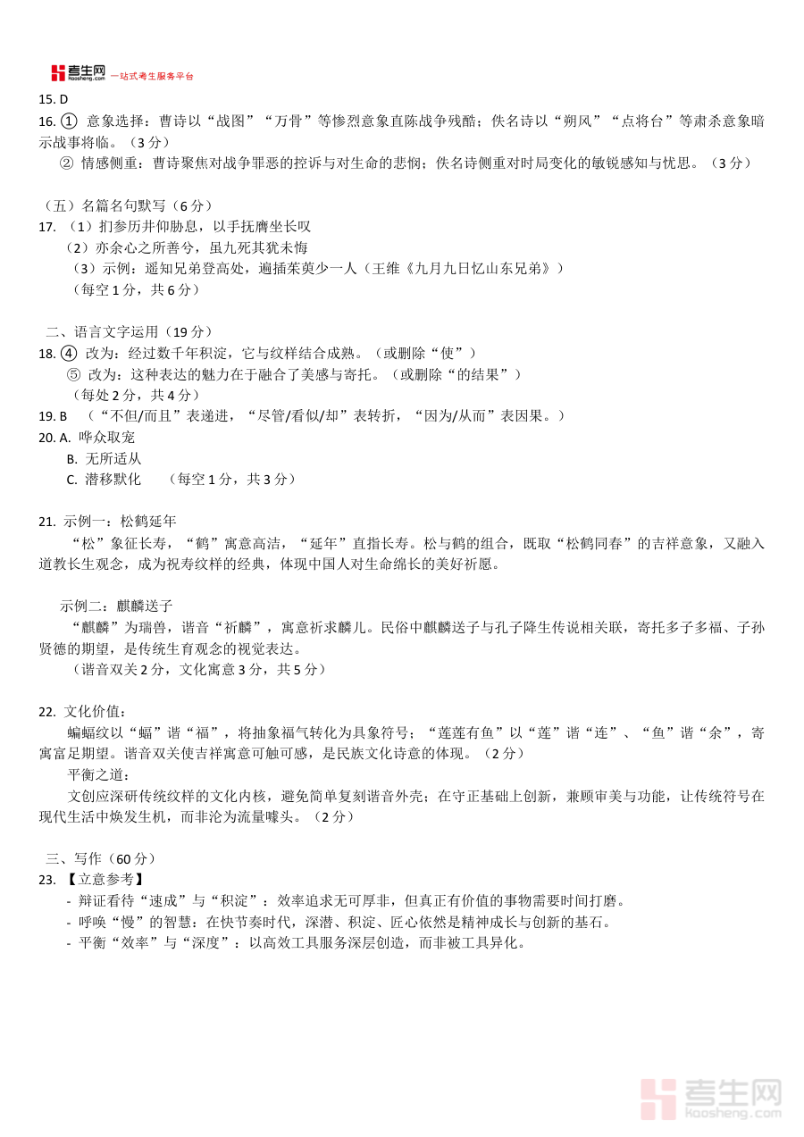 这份语文答案资料具有多方面实用价值:对学生而言可辅助完成学情诊断,让学生在联考后及时知晓自身在语文知识积累、阅读理解、写作表达等方面的掌握程度与薄弱环节;对教师来说提供客观测评依据,有助于精准分析班级整体学习状况并调整后续教学进度与备考策略;对学校管理层面则支持联考数据汇总与对比分析,为区域高三语文教学质量评估提供重要参考。