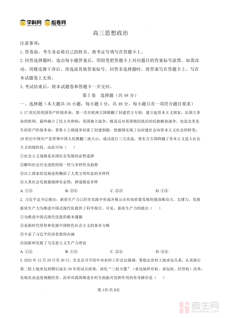 这份试卷的核心用途在于为师生提供学情诊断的可靠依据,帮助学生清晰认知自身在政治学科学习中的优势与薄弱环节,同时为教师调整教学计划、优化备考指导策略提供数据支撑。通过完成试卷及后续分析,能够有效梳理已学知识体系,明确后续复习方向,推动备考进程的有序高效推进。