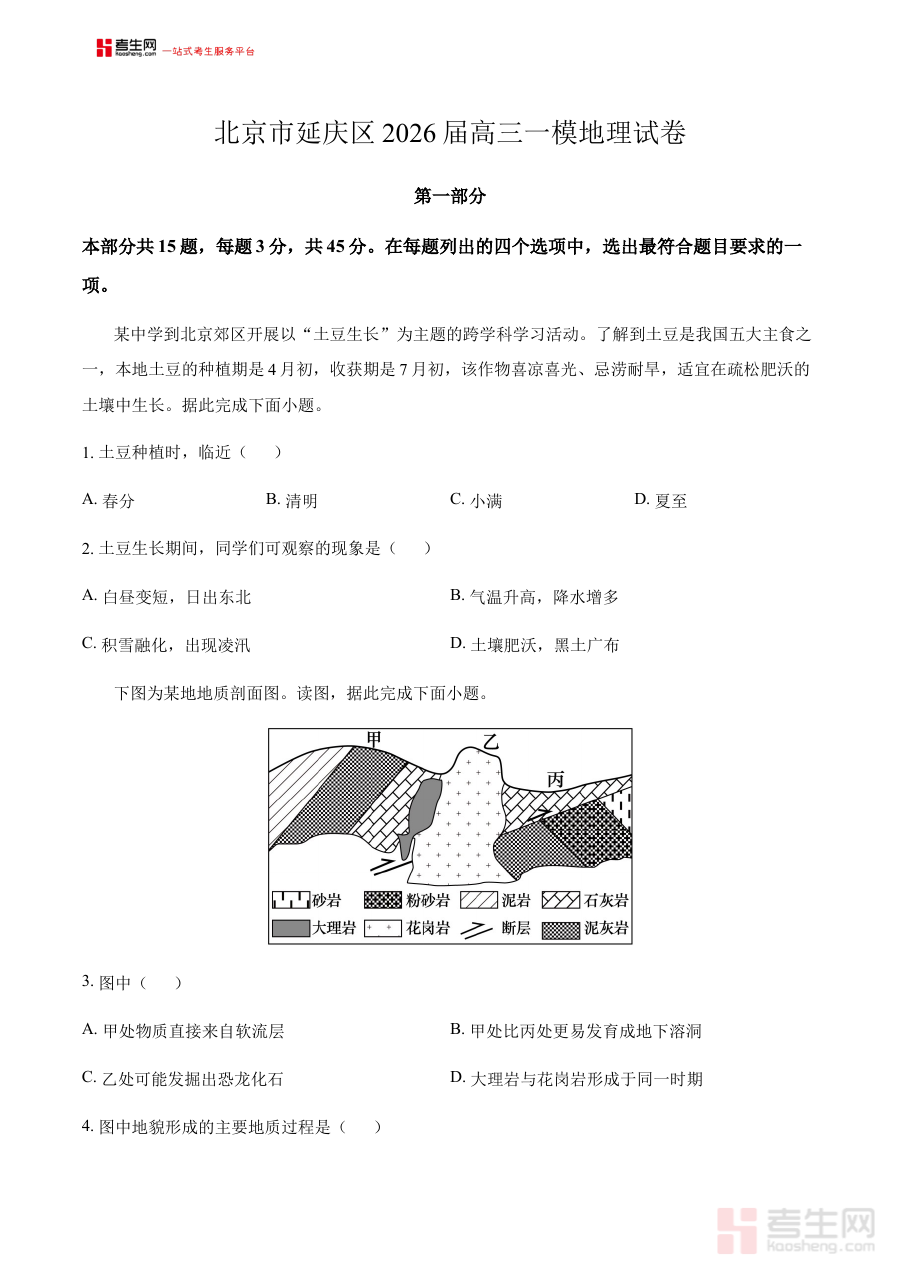 《北京市延庆区2026届高三一模地理试卷(含答案)》是北京市延庆区教育系统针对2026届高三年级学生推出的地理学科第一次模拟考试标准化资料组合,包含完整试卷主体及对应参考答案。作为高三阶段关键阶段性评估工具,该资料严格遵循本地高三地理教学大纲与考试说明编制,能为学生营造接近正式考试的练习环境,帮助提前适应考试节奏与答题规范。