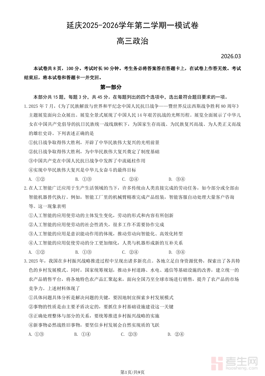 《北京市延庆区2026届高三一模政治试卷(含答案)》是针对北京市延庆区2026届高三学生设计的模拟考试资料,属于高三阶段重要的一模检测试卷。该资料贴合本地教学实际与高考备考节奏,为学生提供了与正式一模考试形式一致的练习载体,是高考前阶段性复习的关键参考资料。