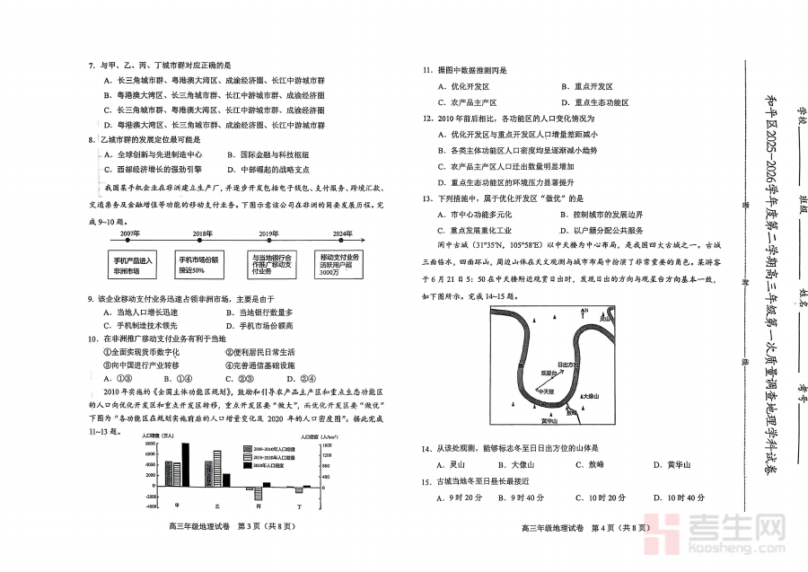 该资料适用于和平区2025-2026学年度的高三学生、地理教师及相关教育教研人员。对于学生而言,它是了解自身初始学习状态、明确备考方向的重要工具;对于教师而言,可借助检测结果调整教学内容与方法;对于教研人员,则能从中获取区域内高三地理学科的初始学业数据,为整体备考规划与教学指导提供参考,具有显著的阶段指导价值。