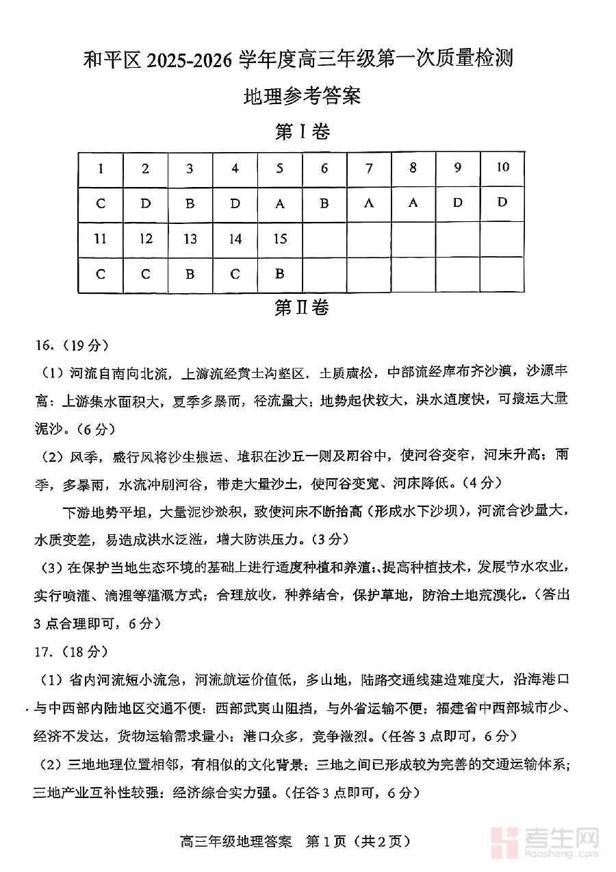 《和平区2025-2026学年度高三年级第一次质量检测 地理答案》是和平区在2025-2026学年度针对高三年级开展的第一次质量检测的地理学科答案资料。作为区域内阶段性教学评估的配套资源,它与该次质量检测试卷形成完整的备考支持体系,为相关教学活动提供明确的参考依据。