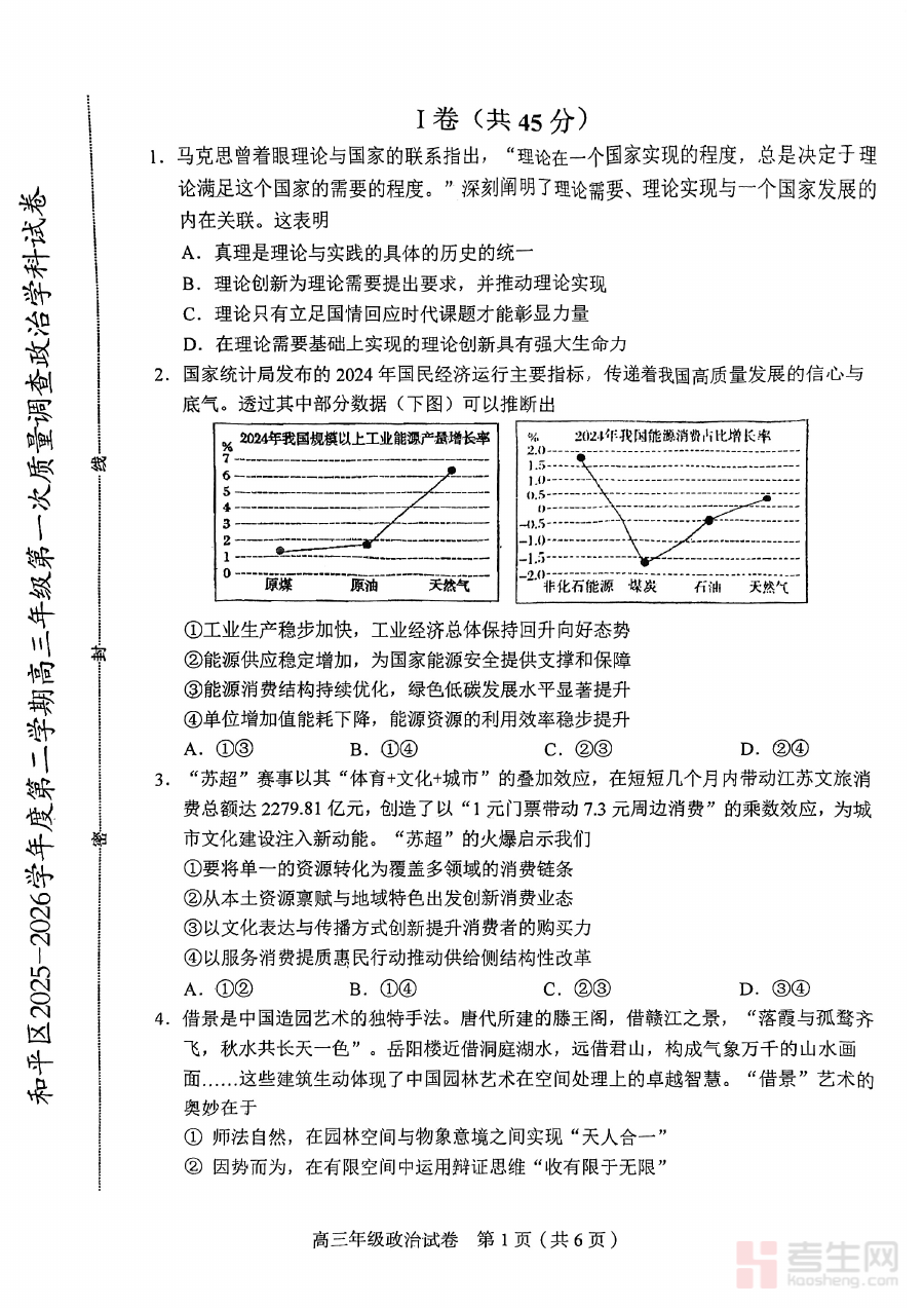 本资料适用于和平区2025-2026学年度高三年级的政治学科师生群体,对于学生而言,它能帮助其明确自身学习短板、制定针对性复习计划;对于教师而言,可借助检测结果精准把握教学重点与学生共性问题,提升教学效率与备考指导的有效性,具有较强的实践参考价值。