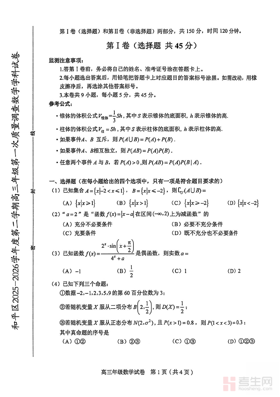 此资料适用于和平区2025-2026学年度的高三学生、数学教师及教育教研人员,作为高三初期关键的质量检测参考工具,它不仅能帮助学生快速适应高三备考节奏,还能辅助教师精准把握教学重点与难点,共同推动高效备考体系的构建与实施,为提升整体数学学习效果奠定坚实基础。