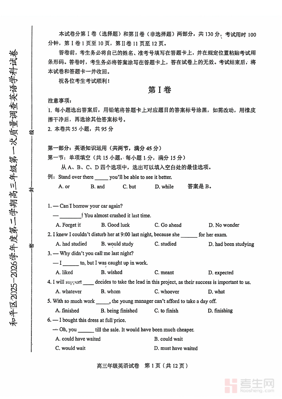 该资料适用于和平区2025-2026学年度高三学生及英语教师,作为高三阶段首次质量检测资料,其价值在于帮助学生适应高三考试节奏,明确备考方向,也为教师开展针对性教学与复习指导提供有效参考,共同提升高三英语备考的科学性与效率。