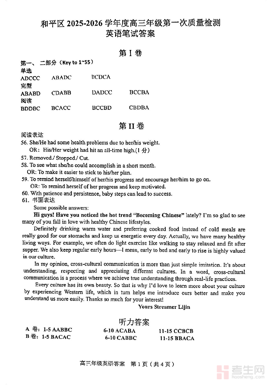 《和平区2025-2026学年度高三年级第一次质量检测 英语答案》是和平区教育系统在2025至2026学年度针对高三年级开展的首次阶段性质量检测所对应的英语科目答案资料,属于区域内高三教学质量评估体系的重要组成部分,为参与此次检测的师生提供了权威且规范的解答参考,是该阶段英语学科备考过程中的关键配套资源之一。