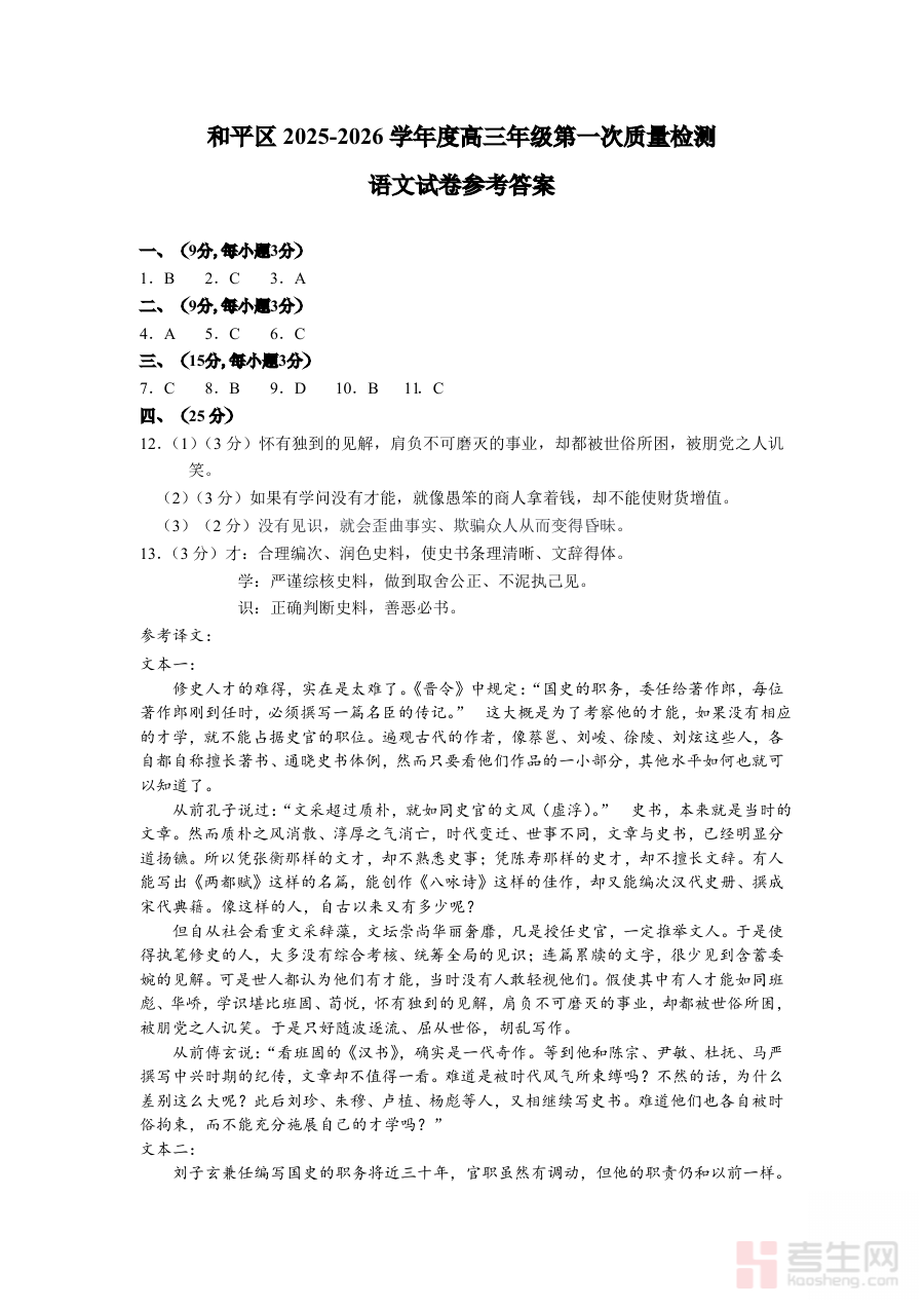 《和平区2025-2026学年度高三年级第一次质量检测 语文答案》是和平区教育系统针对该学年度高三年级首次语文质量检测推出的配套参考资料。该资料聚焦高三第一学期初期阶段性学习成果检验需求,与区域高三语文教学进度及备考导向高度契合,为参与此次检测的师生提供了规范的答题参照依据。作为高三阶段首个重要质量检测的语文答案载体,它既是对前期语文学习效果的系统性反馈工具,也是衔接高三初期复习与后续深度备考的关键纽带。
