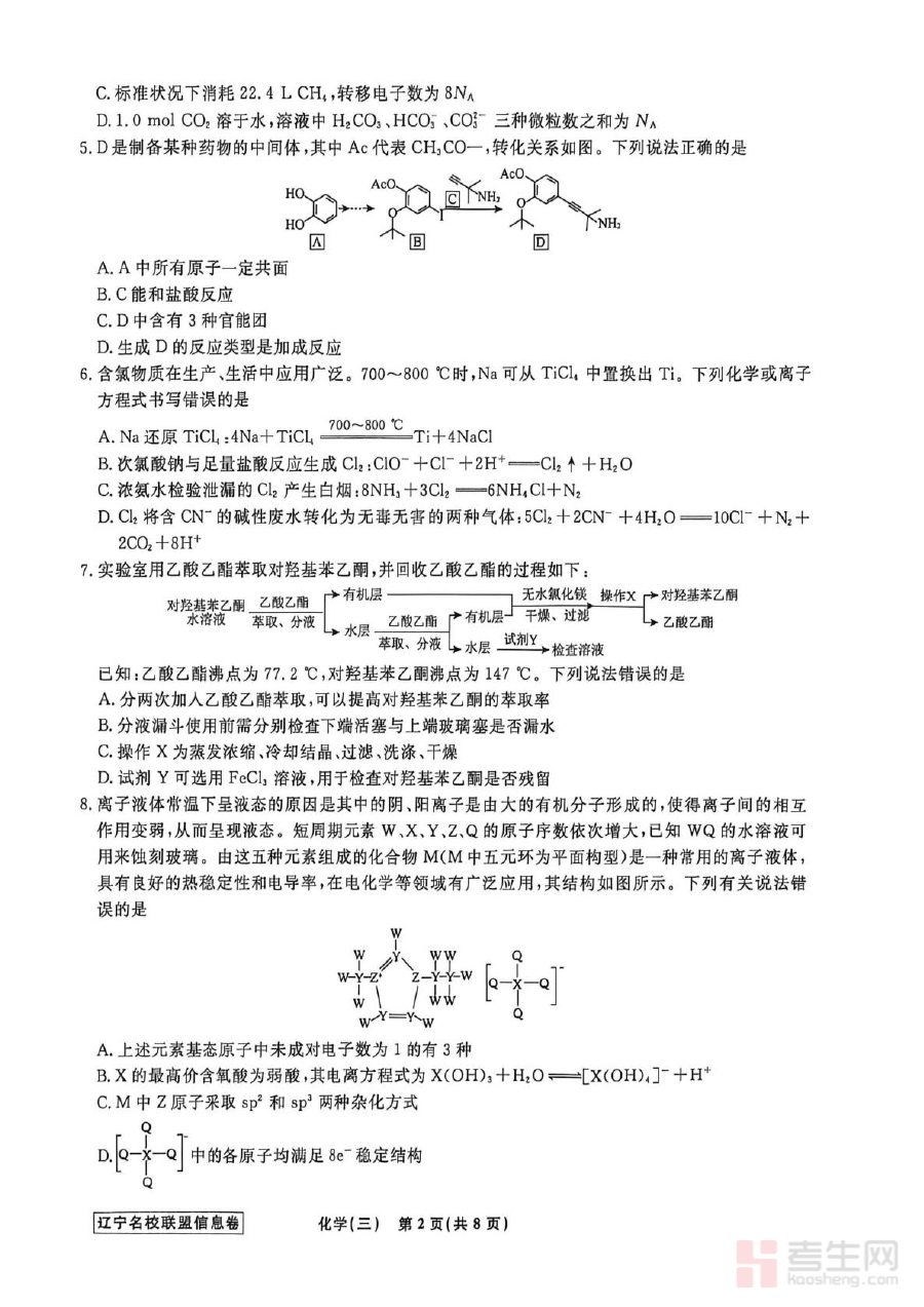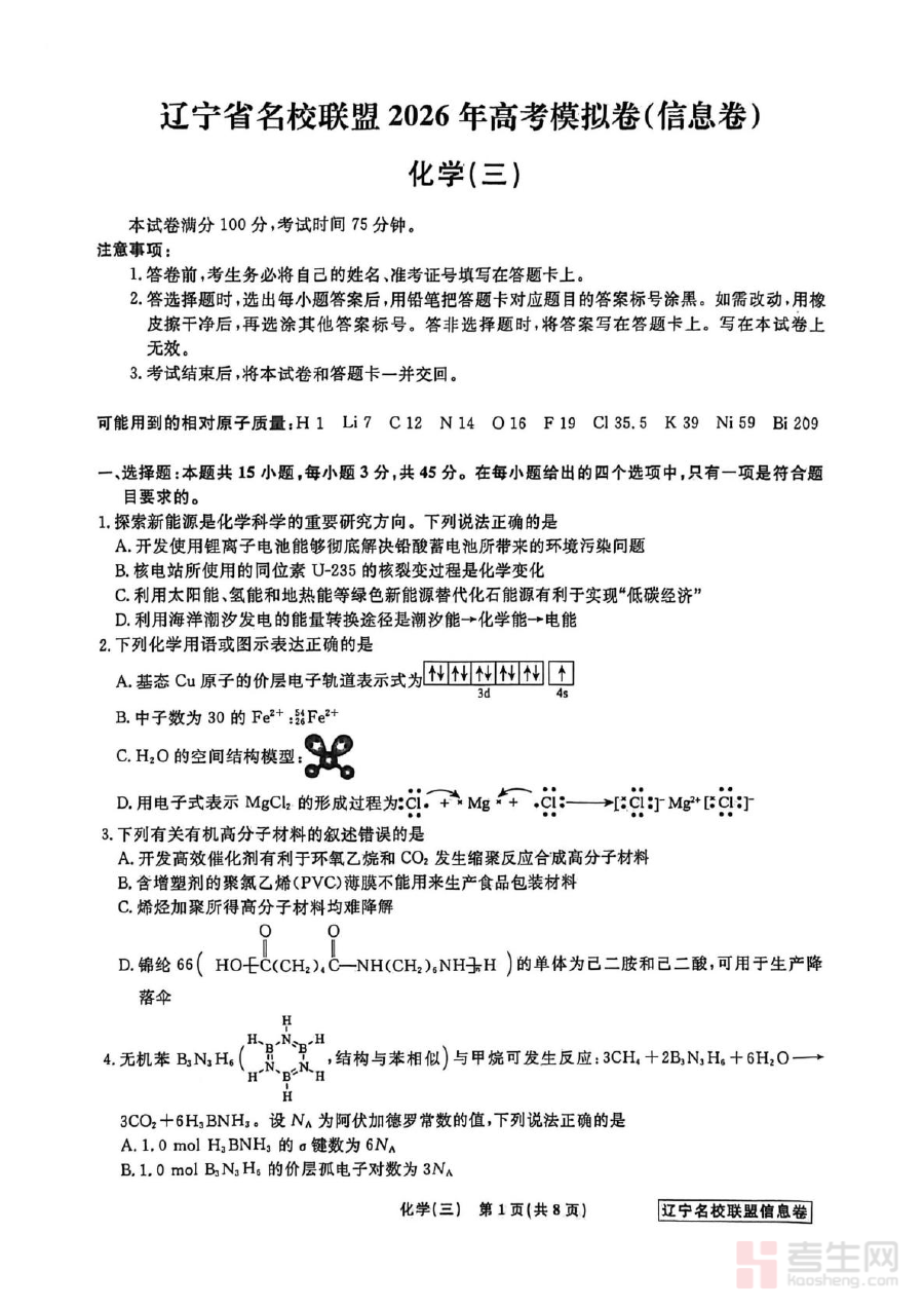 《辽宁省名校联盟2026届高三下学期高考模拟卷(信息卷)(三)化学试卷(含答案)》是针对辽宁省2026届高三学生设计的高考化学备考资料,由省内名校联盟联合推出,属于高三下学期阶段的信息卷系列第三套。该资料紧密贴合辽宁省高考化学的命题趋势与区域教学实际,为学生提供了与高考难度和形式相匹配的模拟训练内容,助力学生提前适应高考化学的考查模式与节奏。