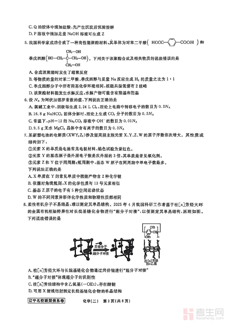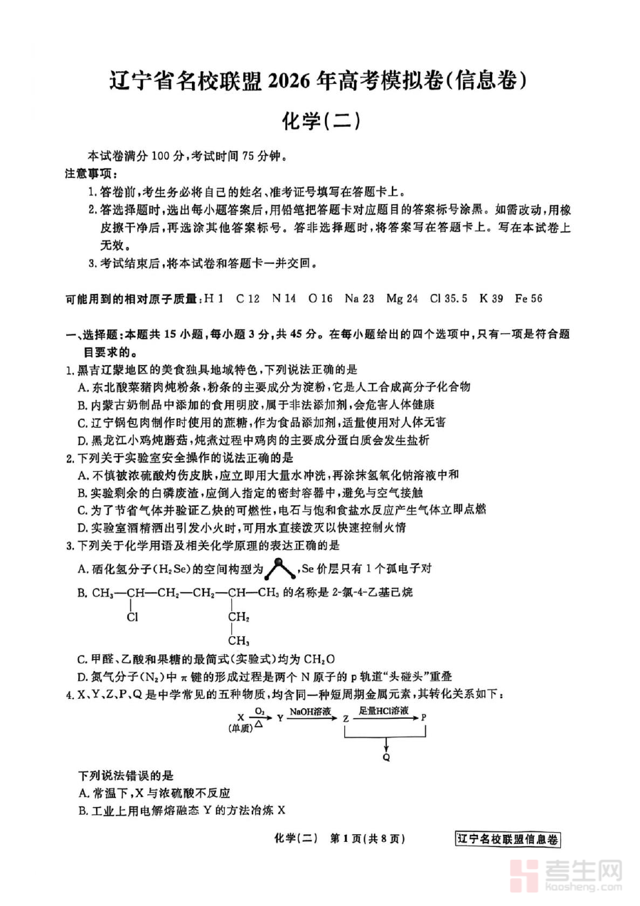 《辽宁省名校联盟2026届高三下学期高考模拟卷(信息卷)(二)化学试卷(含答案)》是针对辽宁省2026届高三学生打造的高考化学模拟备考资料,由省内知名学校组成的联盟联合开发,属于高三下学期信息卷系列的第二套。该资料严格遵循辽宁省高考化学的命题导向与评价标准,为考生提供了与高考实际场景高度契合的模拟训练机会,助力考生提前适应高考化学的考试节奏与命题风格。