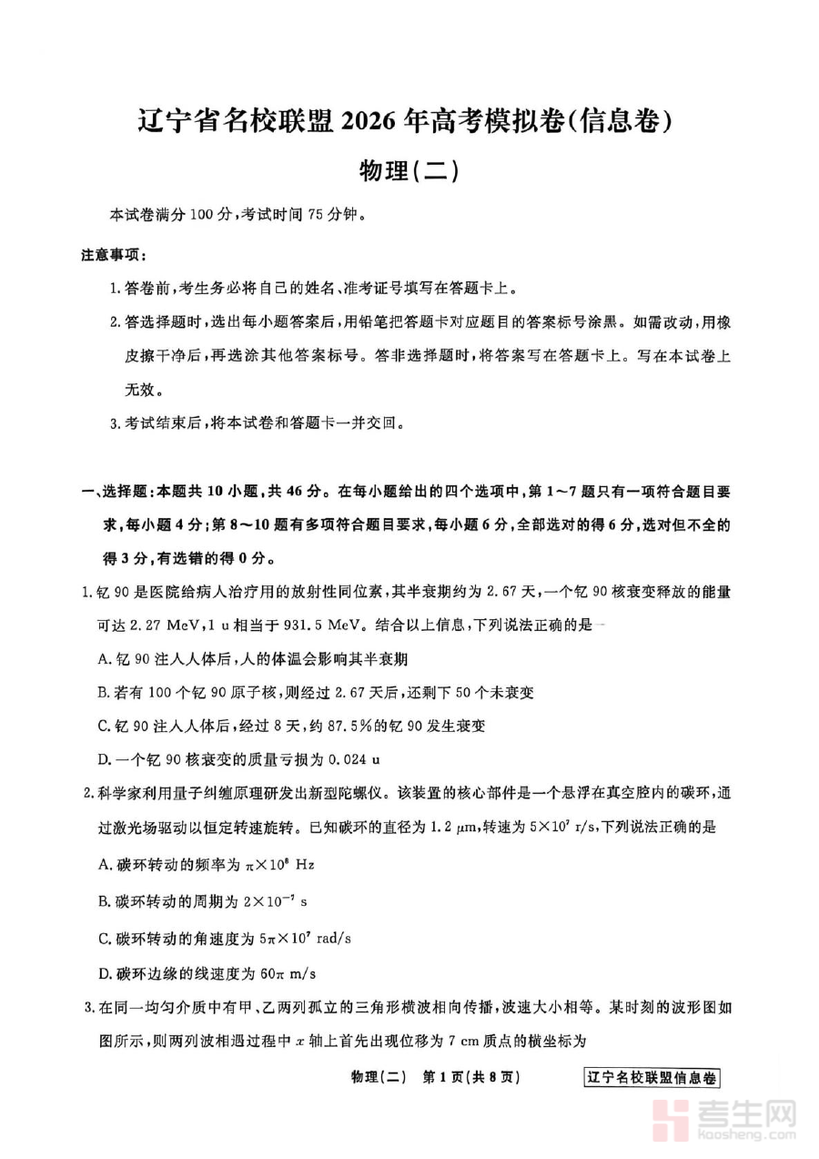 其适用人群主要为辽宁省2026届高三物理学习者及相关学科教师。对于学生而言,完成该模拟卷可熟悉高考物理的考查形式与答题节奏,提升应试能力;对于教师而言,可借助该资料了解学生阶段学习状况,为后续教学与复习安排提供数据支持,具有显著的阶段检测与备考规划价值。