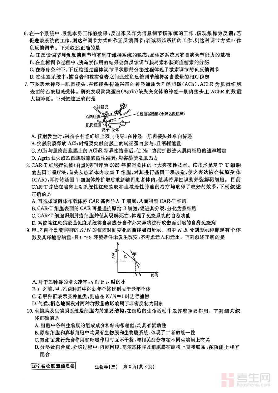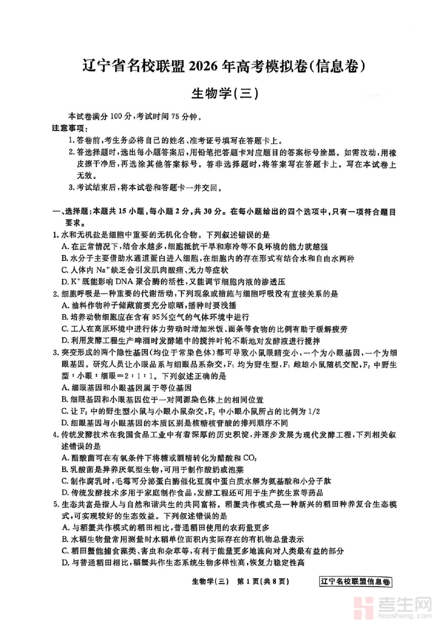 此试卷主要适用于辽宁省2026届高三年级学生,特别是参与名校联盟教学协作的学生群体,作为阶段性检测与备考规划的核心资料之一,它能够帮助学生在高考冲刺阶段强化知识掌握、熟悉考试流程与命题逻辑,进一步提升应试技巧与时间管理能力,为最终在高考生物科目中取得理想成绩奠定坚实基础。