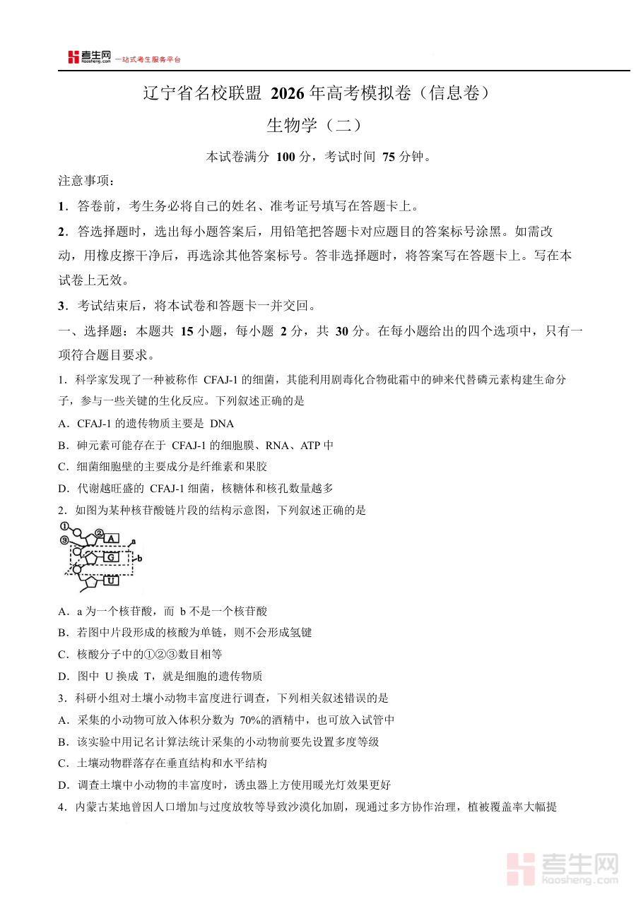 《辽宁省名校联盟2026届高三下学期高考模拟卷(信息卷)(二)生物试卷》是辽宁省内名校联盟针对2026届高三学生开发的高考生物学科模拟备考资料,属于高三下学期阶段的信息卷系列第二套试卷。该资料立足辽宁省高考生物命题的整体方向与区域特色,旨在为考生提供与真实高考接轨的模拟训练场景,帮助考生提前适应高考生物考试的题型结构与考查节奏,为后续的冲刺复习奠定基础。
