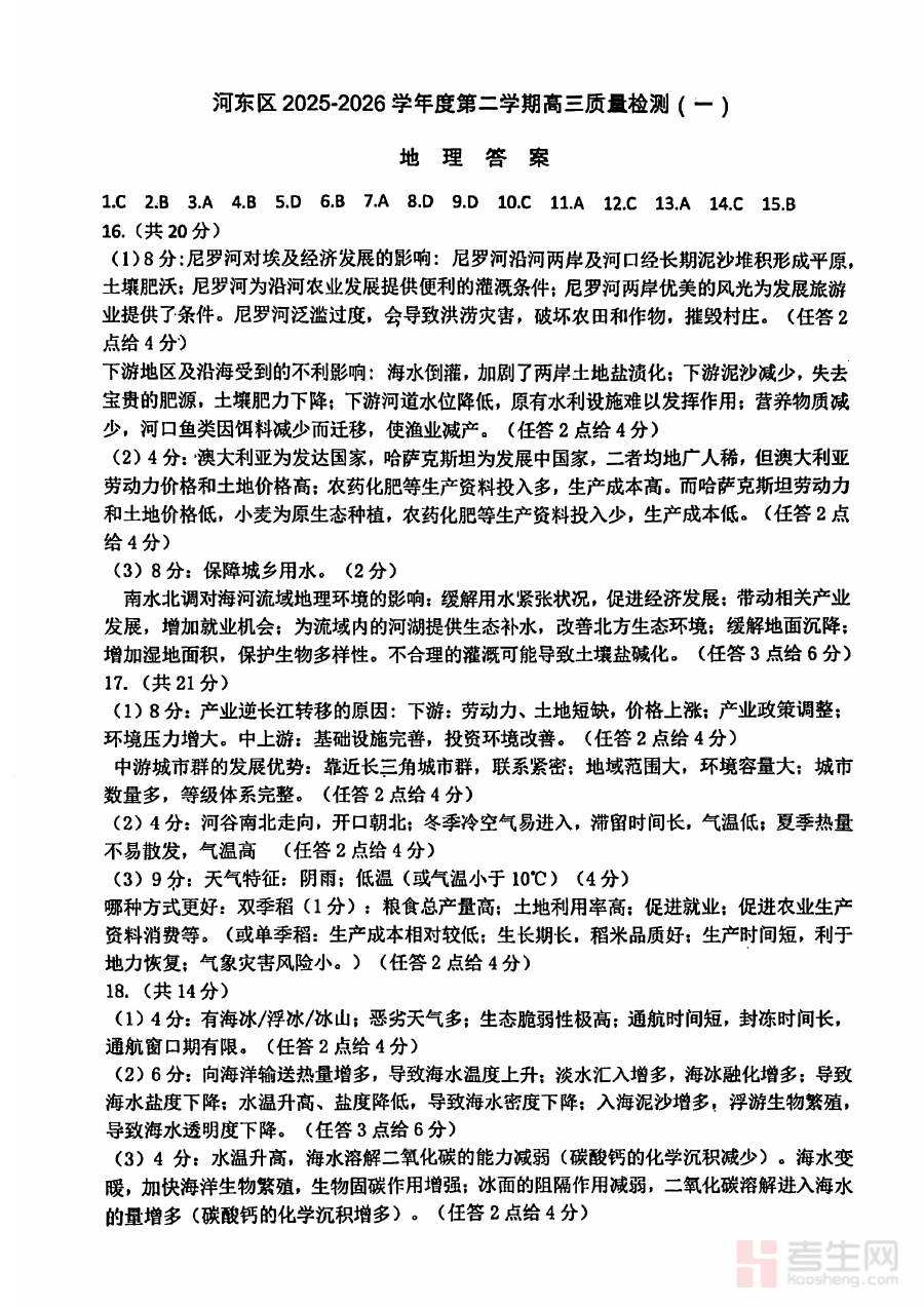 《河东区25-26高三一模【地理答案】》是河东区25-26学年高三第一学期模拟考试地理科目的配套参考答案资料。作为区域内高三阶段重要的阶段性测试资源,该答案针对本次一模考试提供了标准化的作答参考,为相关群体了解本次考试的答题标准与评分依据提供了直接支撑,是衔接日常教学与高考备考的关键辅助材料。