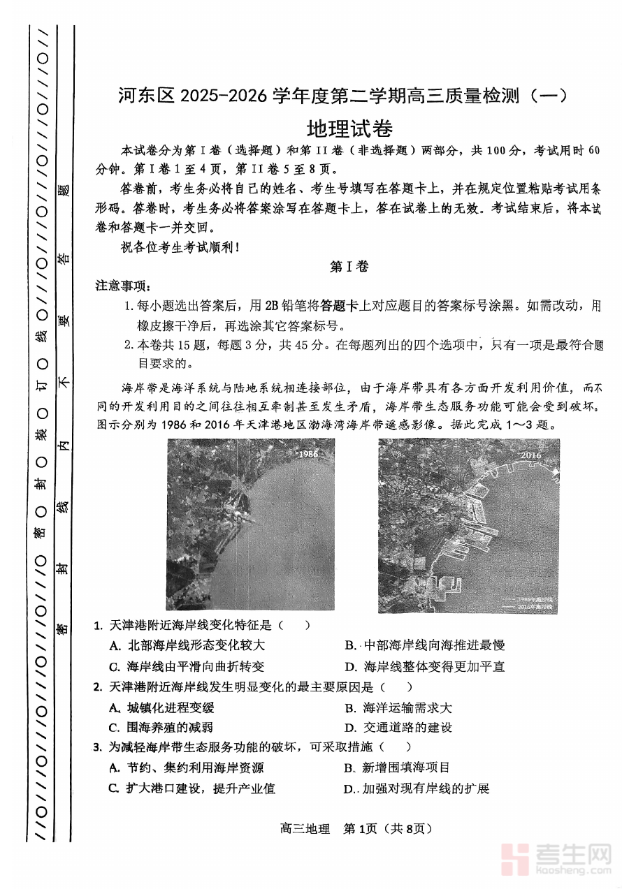《河东区25-26高三一模【地理试题】》是河东区25-26学年高三第一学期第一次模拟考试的地理学科专用试题资料。作为区域内高三阶段关键的阶段性评价载体,该资料紧密贴合当地高三地理教学大纲与一模考试的命题要求,为学生提供了与正式考试形式高度一致的练习场景,是高三学生在一轮复习后期进行自我能力检测与知识巩固的重要参考材料,能够帮助学生提前熟悉考试流程与考查方向,为后续备考明确重点。