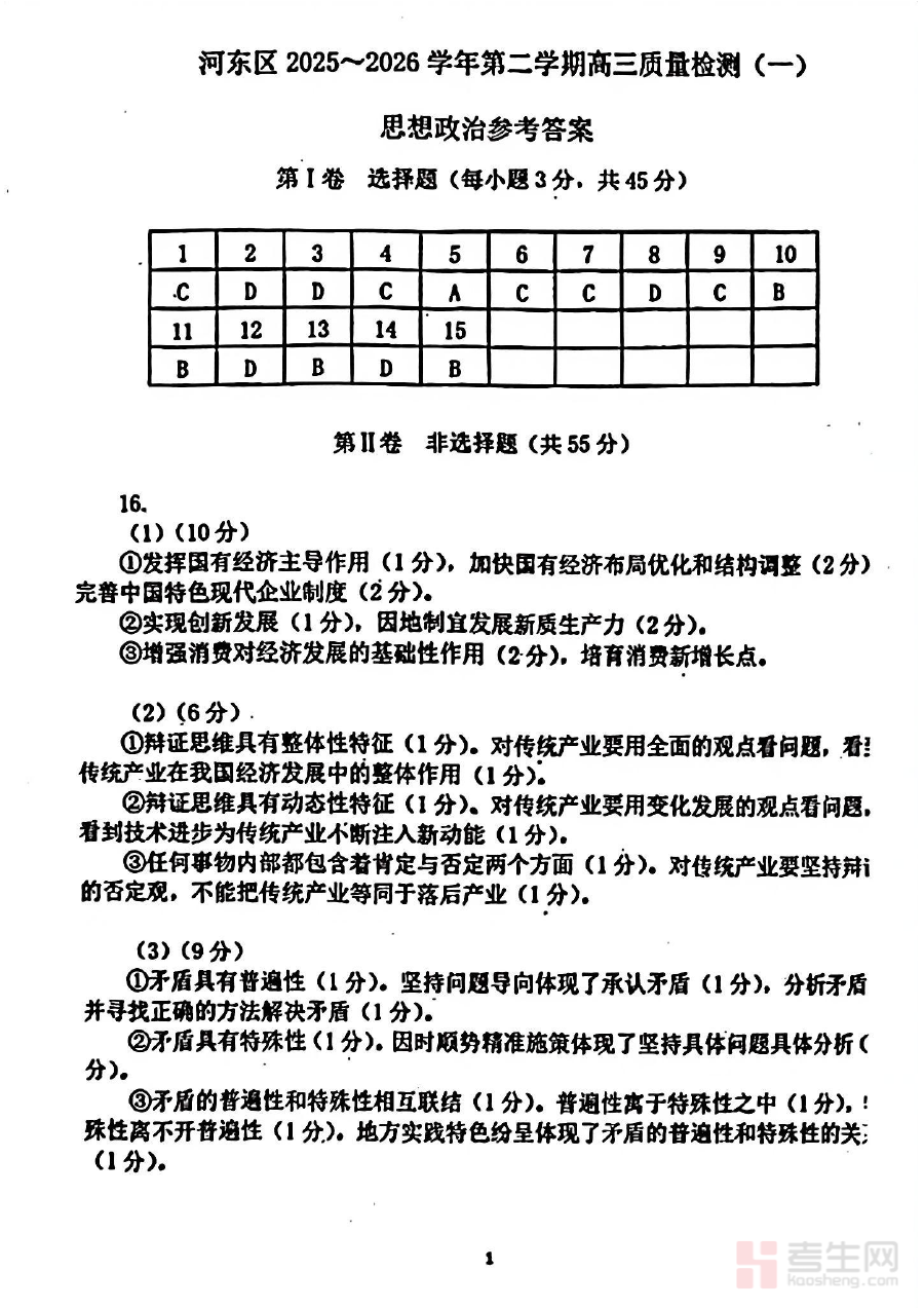 《河东区25-26高三一模【政治答案】》是天津市河东区2025-2026学年高三年级第一学期模拟考试政治学科的配套答案资料。作为高三阶段重要的阶段性测评资源,该资料与河东区高三一模政治试卷紧密对应,能够为使用者提供权威准确的作答参考依据,是高三政治备考过程中关键的辅助材料之一。