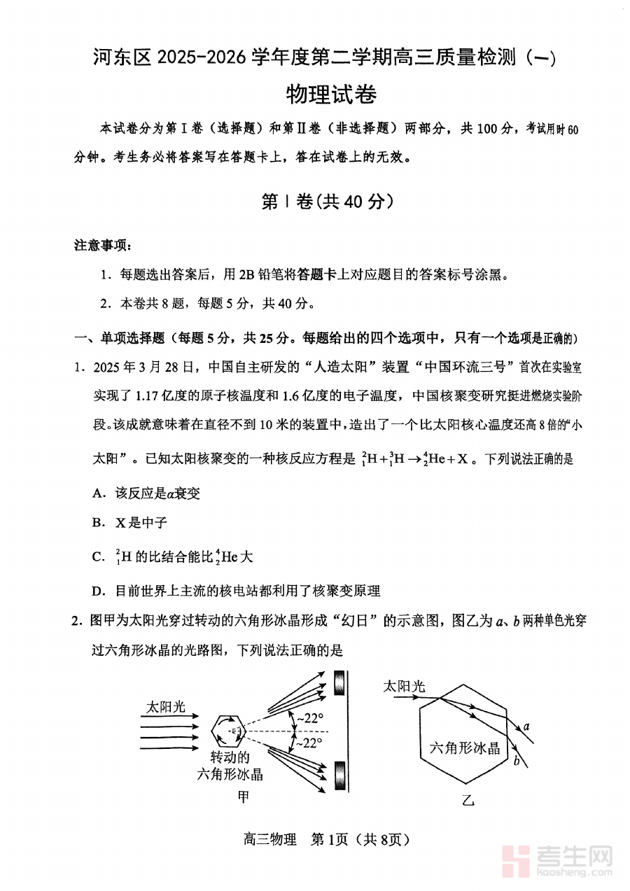 《河东区25-26高三一模【物理试题】》是河东区教育系统针对25至26学年高三年级第一学期模拟考试编制的物理学科专用试题资料,属于高三阶段重要的区域性阶段性检测工具。该试题严格遵循当学年高三物理教学大纲与区域备考指导要求,紧密贴合高三一轮复习的知识覆盖范围,为高三学生提供与正式一模考试一致的题型结构与考查形式载体,帮助学生提前熟悉区域考试的命题逻辑与重点考查方向,是高三物理备考过程中用于阶段性评估与练习的核心资料之一。