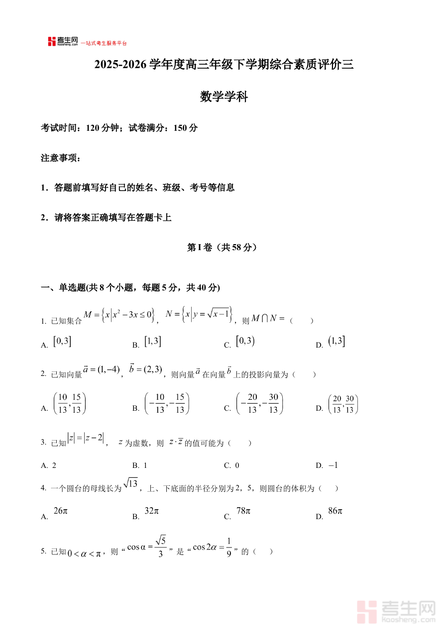《精品解析:河北衡水中学2025-2026学年度高三年级下学期综合素质评价三数学学科试题(原卷版)》是针对河北衡水中学2025-2026学年度高三年级下学期综合素质评价三数学学科考试的备考资料,聚焦该阶段数学学科的阶段性检测需求,为相关群体提供贴合实际考试场景的原卷内容。