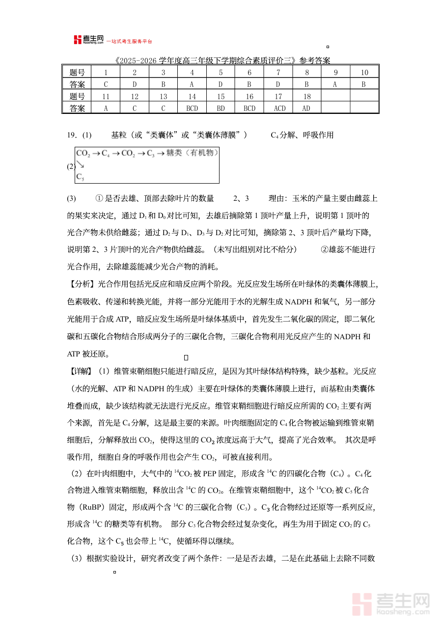 《2025-2026学年度高三年级下学期综合素质评价三生物答案》是对应该学年度高三年级下学期生物学科综合素质评价三测试的配套参考答案资料。该评价属于高三生物阶段学习成果的重要检测形式之一,旨在通过标准化测试评估学生的生物学科核心素养与知识应用能力,而本答案资料则为考生提供了准确核对答题结果的依据,是该阶段生物备考过程中的关键辅助材料。