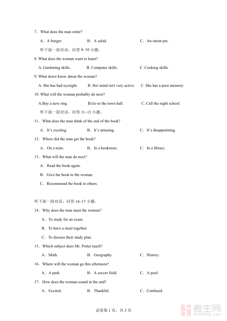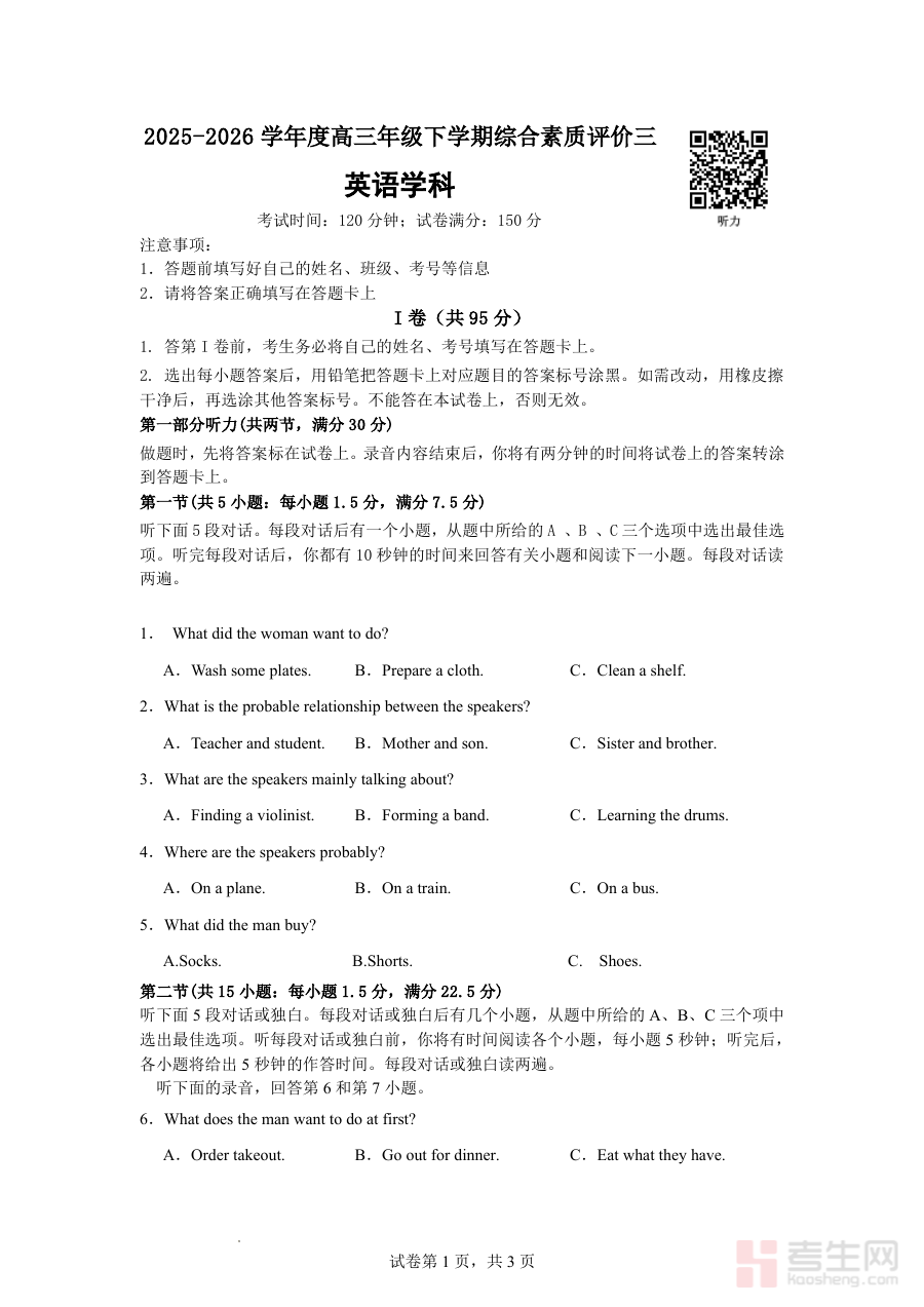 《2025-2026学年度高三年级下学期综合素质评价三英语试卷》是2025-2026学年度高三下学期综合素质评价第三阶段的英语学科检测资料,旨在为高三学生提供贴合当前学习进度的英语能力评估工具,是该阶段英语学科备考的重要参考资料。