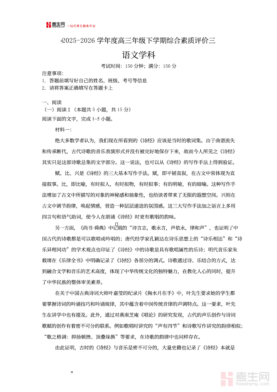 《2025-2026学年度高三年级下学期综合素质评价三语文试卷》是面向该学年度高三下学期学生开发的语文阶段性评价资料,紧密结合高三下学期语文学习核心目标与综合素质评价相关要求,为学生提供与学段进度匹配的语文能力评估载体。作为高三备考关键阶段的重要工具,它能有效反映学生该阶段语文知识积累、能力发展的实际状况,为后续复习安排提供可靠依据。
