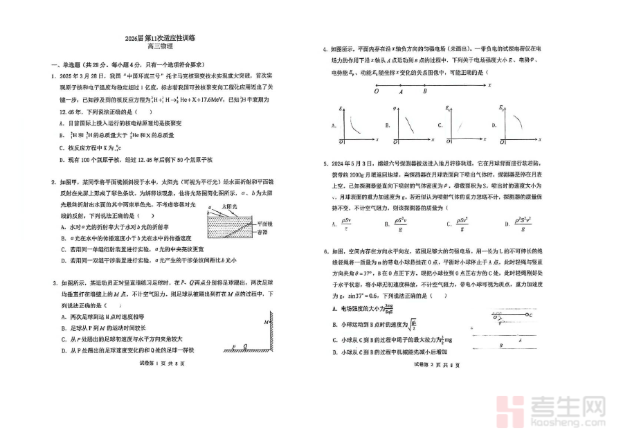 《西北工业大学附属中学2026届高三下学期第十一次适应性训练物理试卷(含答案)》是针对2026届高三学生物理学科的阶段性备考资料,由西北工业大学附属中学推出,属于高三下学期第十一次适应性训练范畴,旨在为学生提供贴合该阶段学习进度与备考需求的练习资源,帮助学生在高考前的关键阶段进行针对性训练,为后续的复习规划提供实践依据。