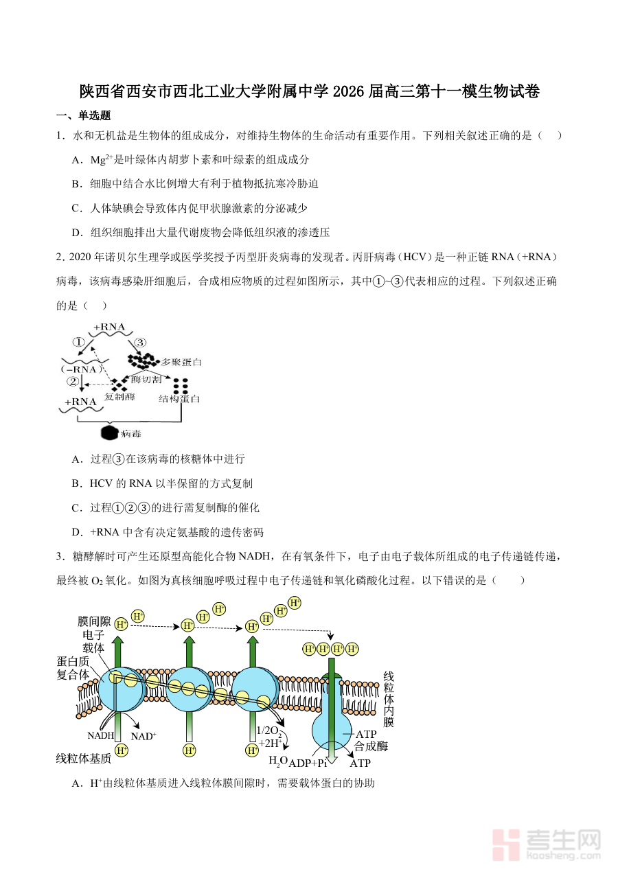 《西北工业大学附属中学2026届高三下学期第十一次适应性训练生物试卷(含答案)》是西北工业大学附属中学为2026届高三学生打造的生物学科阶段性适应性训练资料,属于高三下学期备考进程中的第十一次针对性训练内容,包含完整试卷及配套参考答案。该资料紧密贴合高三下学期生物学科的复习进度与高考命题趋势方向,旨在通过规范的训练形式帮助学生熟悉考试流程节奏,巩固已学知识体系框架,为后续的高考冲刺阶段做好充分准备。