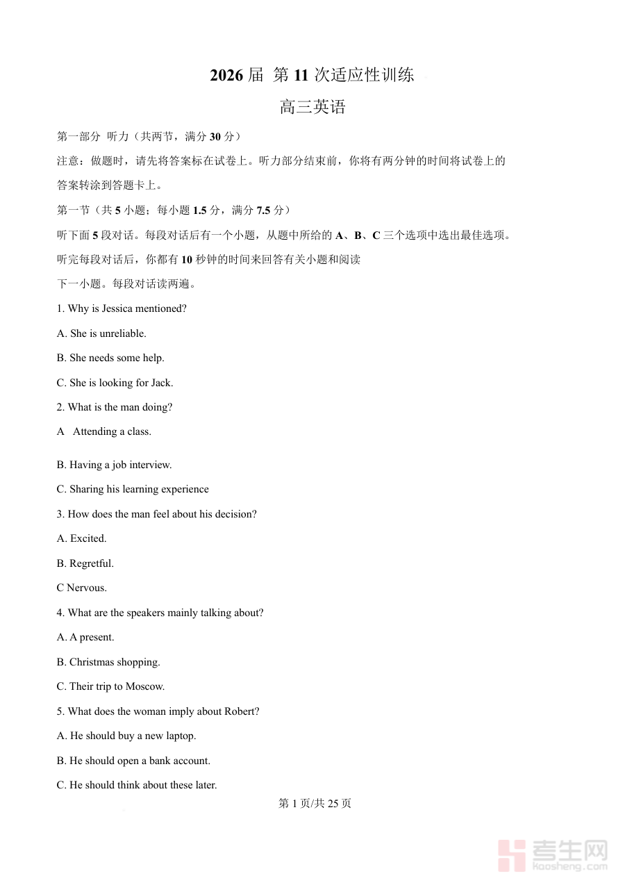 该试卷主要适用于西北工业大学附属中学2026届高三学生开展第十一次适应性训练,也可为同阶段其他备考高考英语的学生提供参考素材,通过模拟考试场景与难度的训练,助力学生熟悉考试流程,强化应试能力,为高考英语科目的高效备考助力。