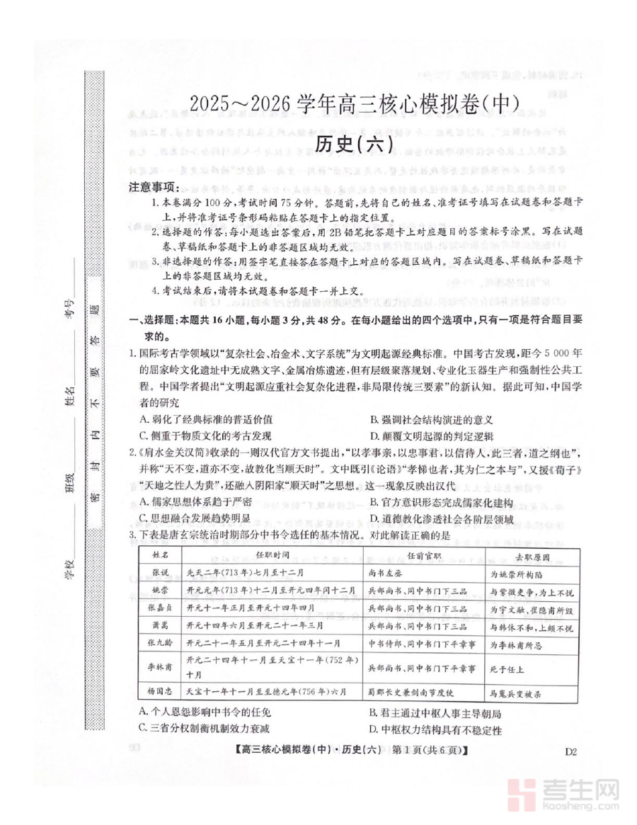 《2025-2026学年度普集高中高三模拟考试历史试题》是针对2025至2026学年度普集高中高三年级学生开发的历史学科模拟考试资料,属于高三阶段历史备考过程中的核心训练素材之一,其设计背景贴合该学年度学校高三历史教学的整体进度与考试要求,能够为师生提供与本校教学实际高度匹配的模拟测试资源。