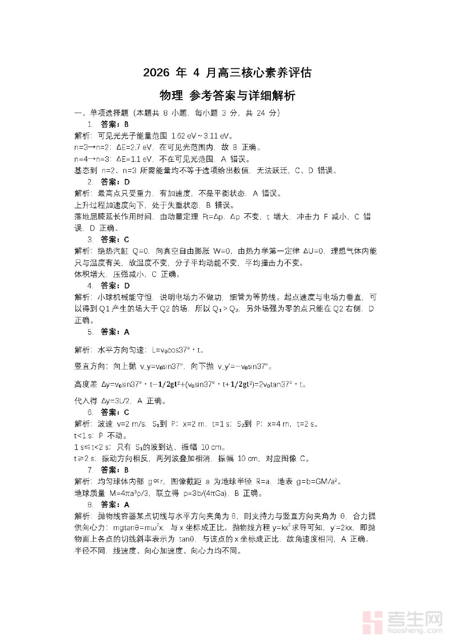 《2026届山东名校考试联盟高三下学期4月核心素养评估物理答案》是面向2026届山东省内参与名校考试联盟的高三学生推出的配套参考答案资料,对应其第二学期4月开展的物理学科核心素养评估考试。该资料依托山东名校考试联盟的命题背景与区域教学特色,聚焦高三阶段物理学科核心素养的考查方向,为考生提供了与本次阶段性评估直接匹配的答案支持,是考生了解自身物理学习成效、验证答题思路的重要参考依据。