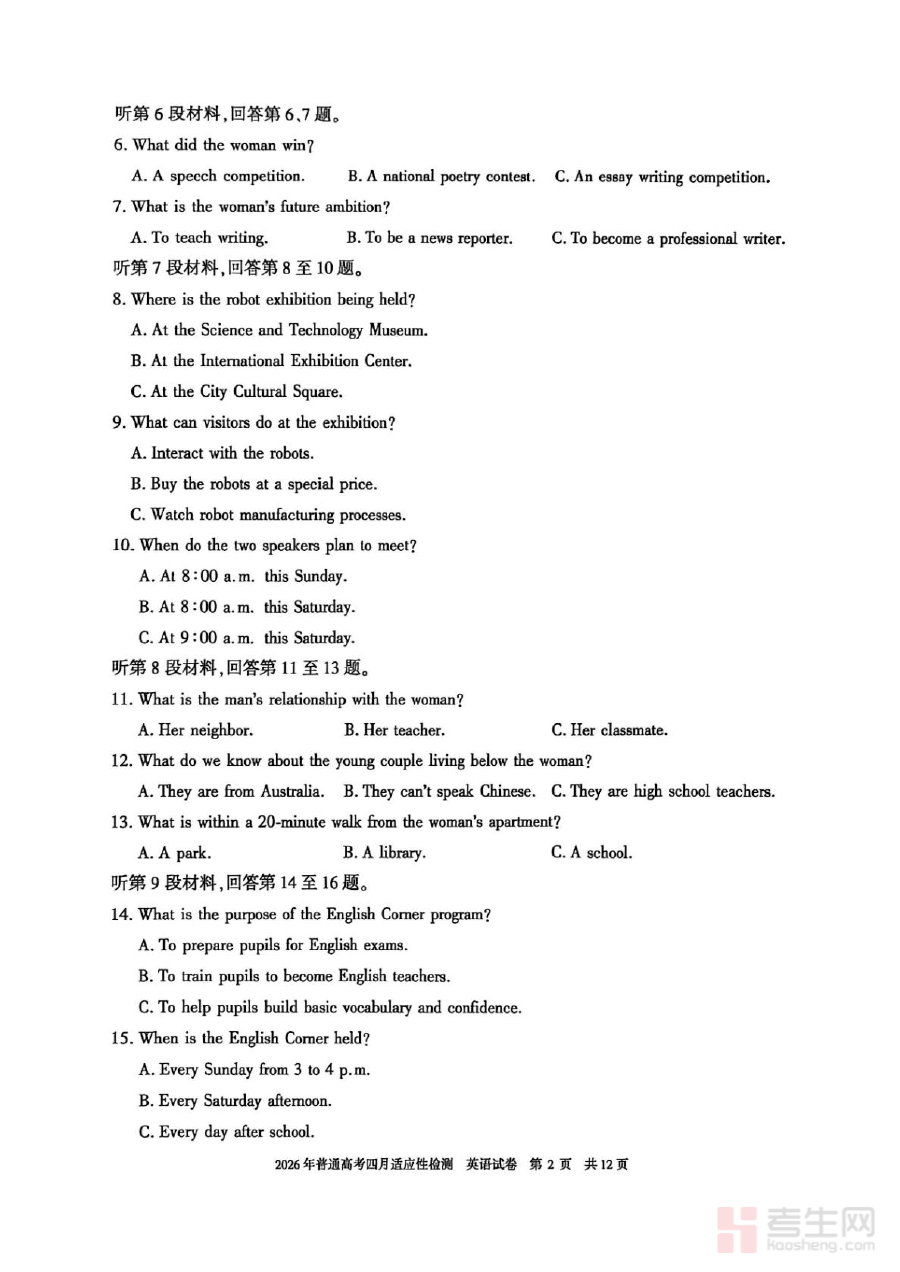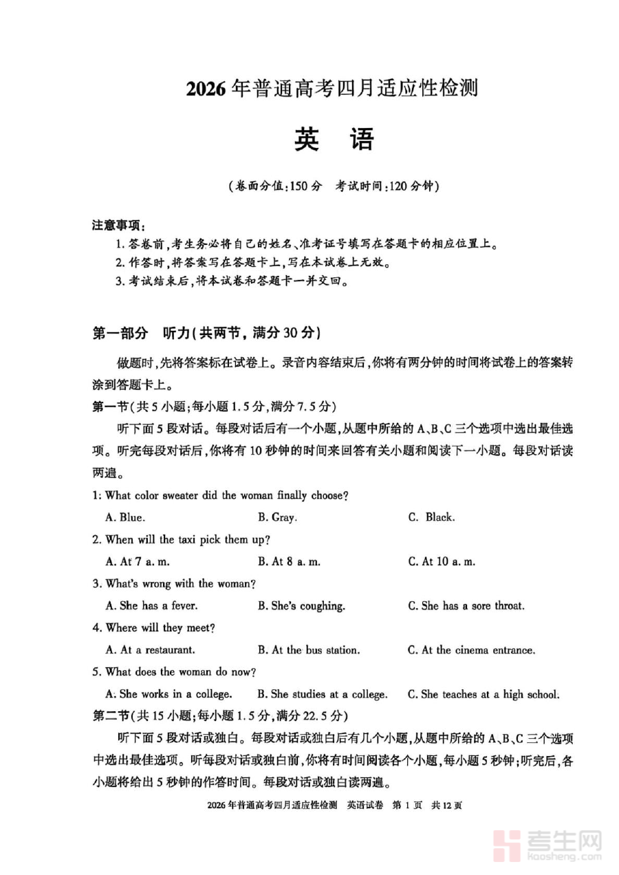 《新疆2026年普通高考四月适应性检测英语试卷及答案 新疆2026年普通高考四月适应性检测英语试卷》是针对新疆地区2026年普通高考设计的阶段性适应性检测资料,结合四月这一高考备考关键节点,为考生提供贴合当地高考命题趋势的实践素材,助力考生提前熟悉高考英语考试的整体框架与考查方向。