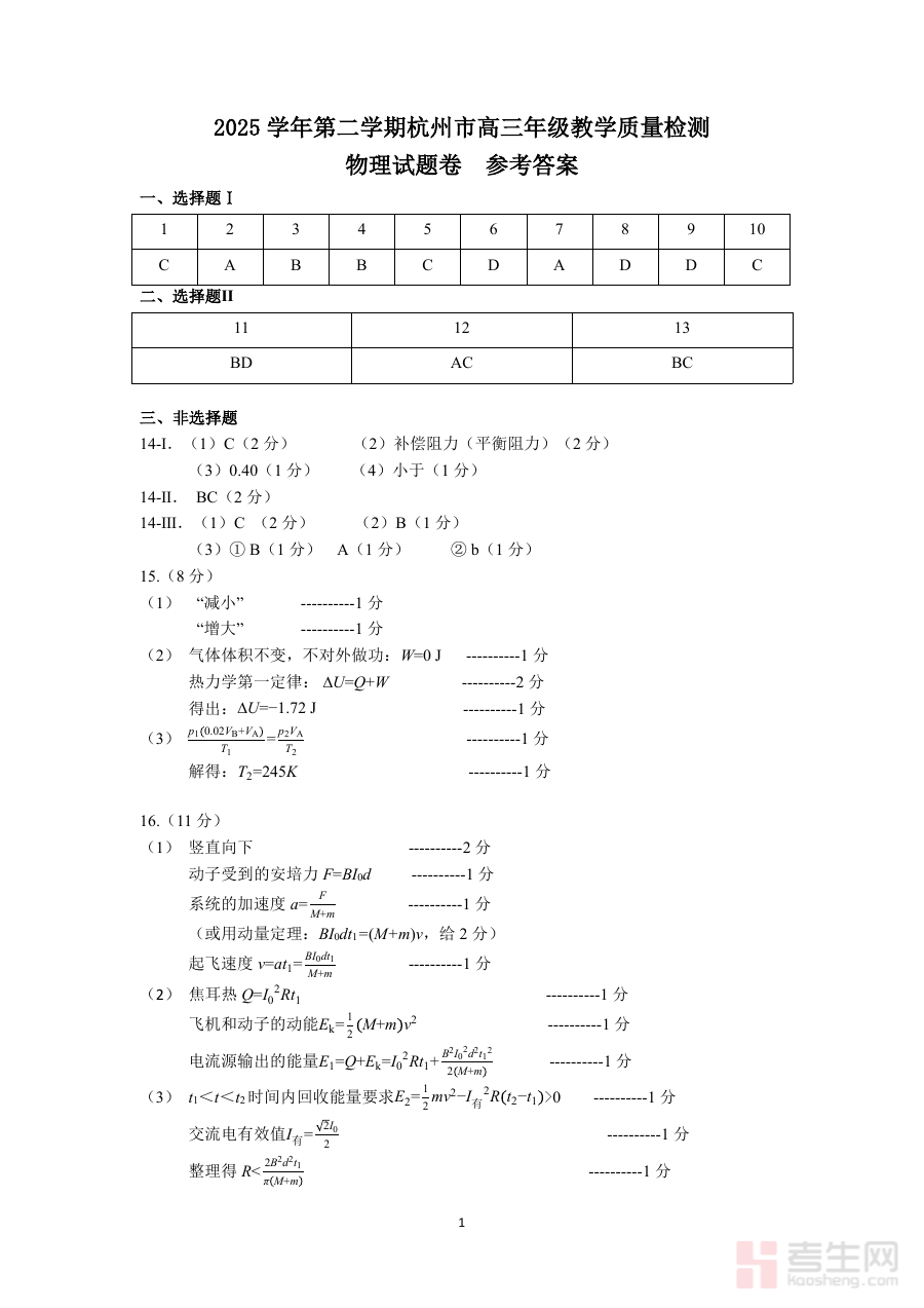 《2026届浙江杭州二模物理答案》是2026届浙江省杭州市普通高中物理学科第二次模拟考试的配套答案资料,针对该地区高三阶段物理学科的阶段性考试设置,为相关教学活动及学生备考提供精准的参考依据。