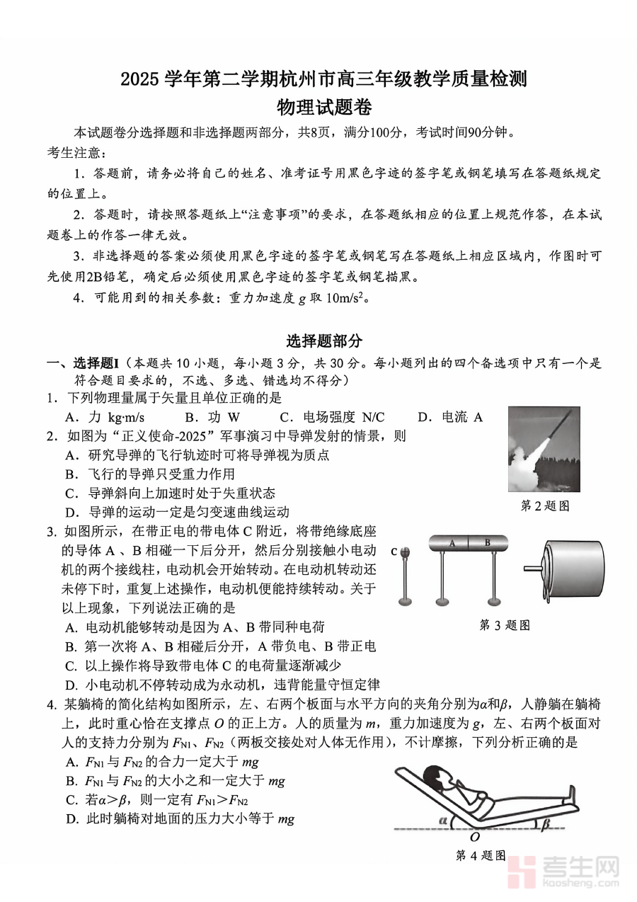 该试题适用于2026届浙江省杭州市的高三物理教师、学生及相关教育教研人员。作为二模阶段的重要检测资料,它不仅能有效反映学生当前的学习状态与知识薄弱点,还能帮助师生明确高考备考的重点方向,提升备考效率与质量,为最终的高考冲刺阶段做好充分准备,推动学生在高考中取得理想成绩。